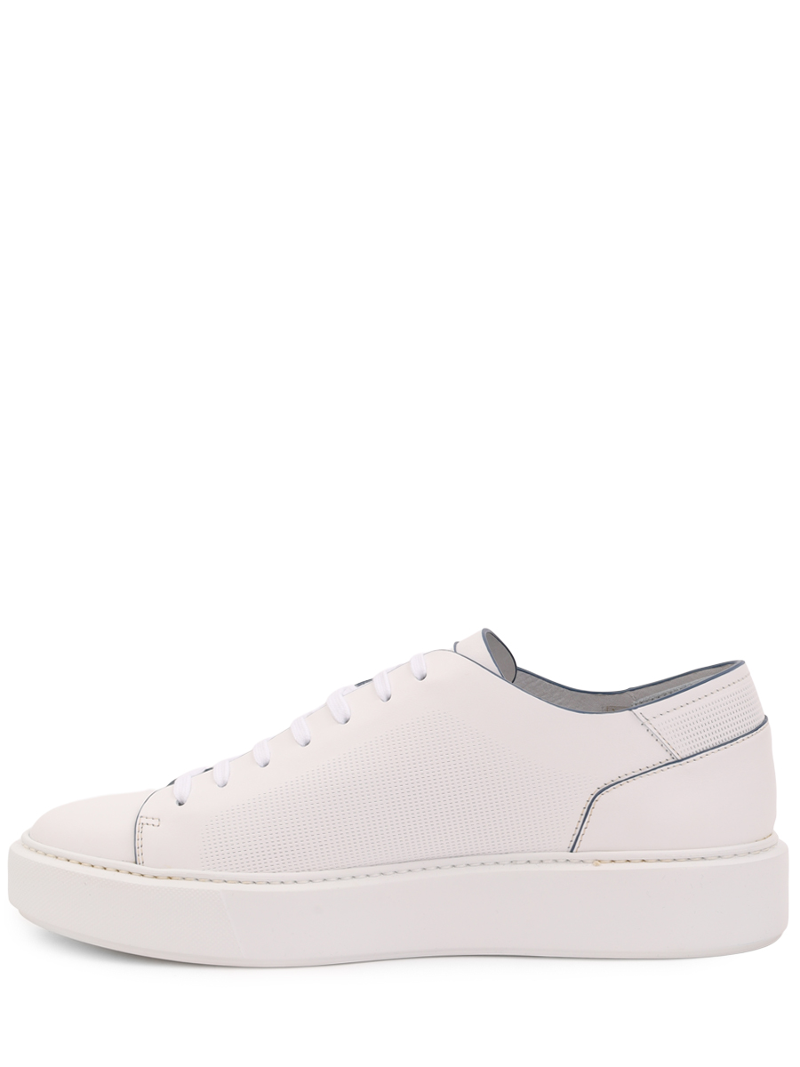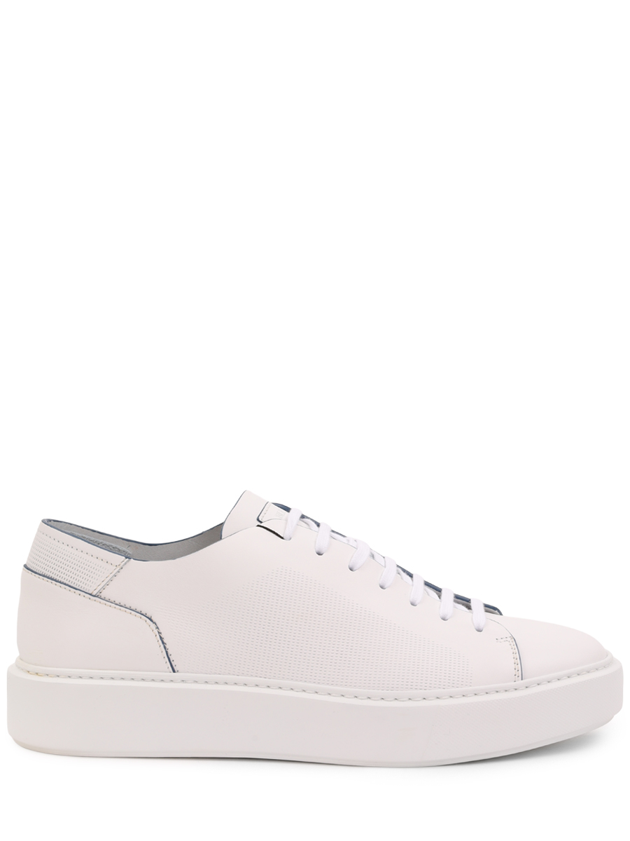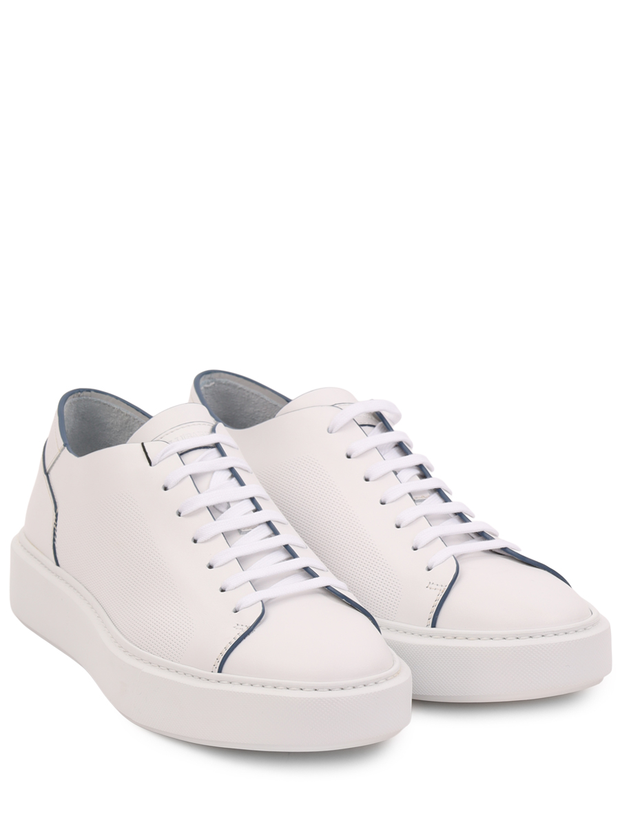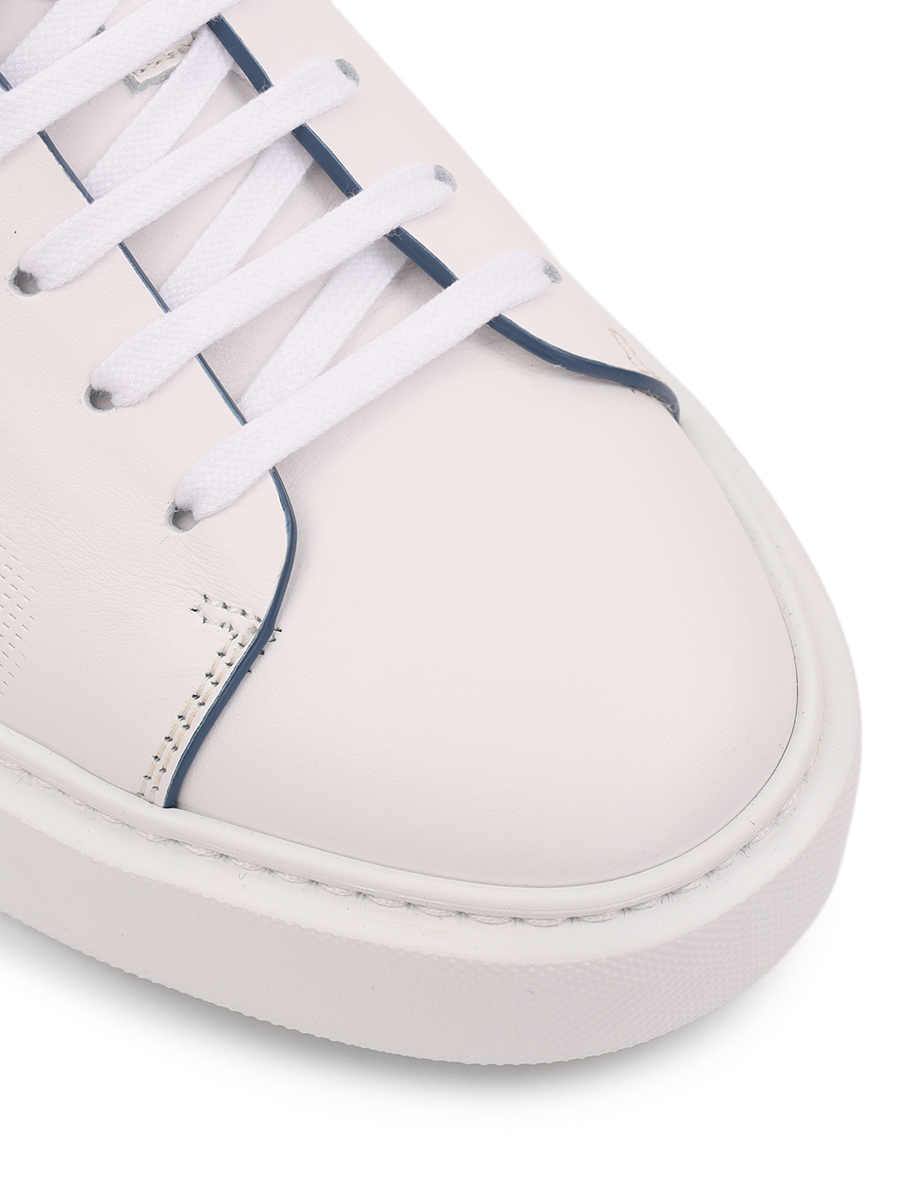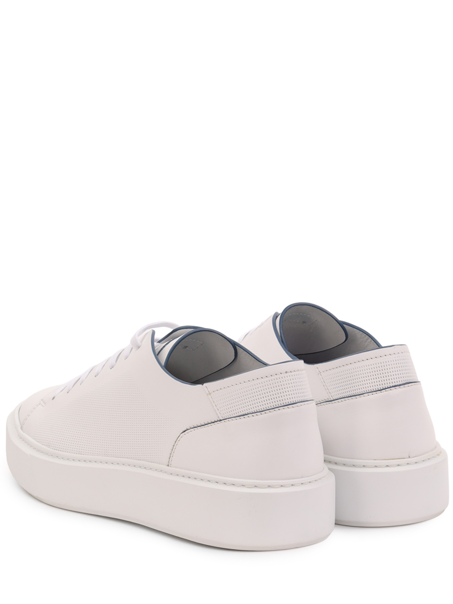 Мастера марки, основанной Джоном Ричардсоном Барреттом, сшили белые кеды из мягкой кожи с матовым блеском. Модель украсили перфорацией, которая выполняет не только декоративную роль, но и функциональную, обеспечивая циркуляцию воздуха. Края деталей деликатно выделили синим кантом.