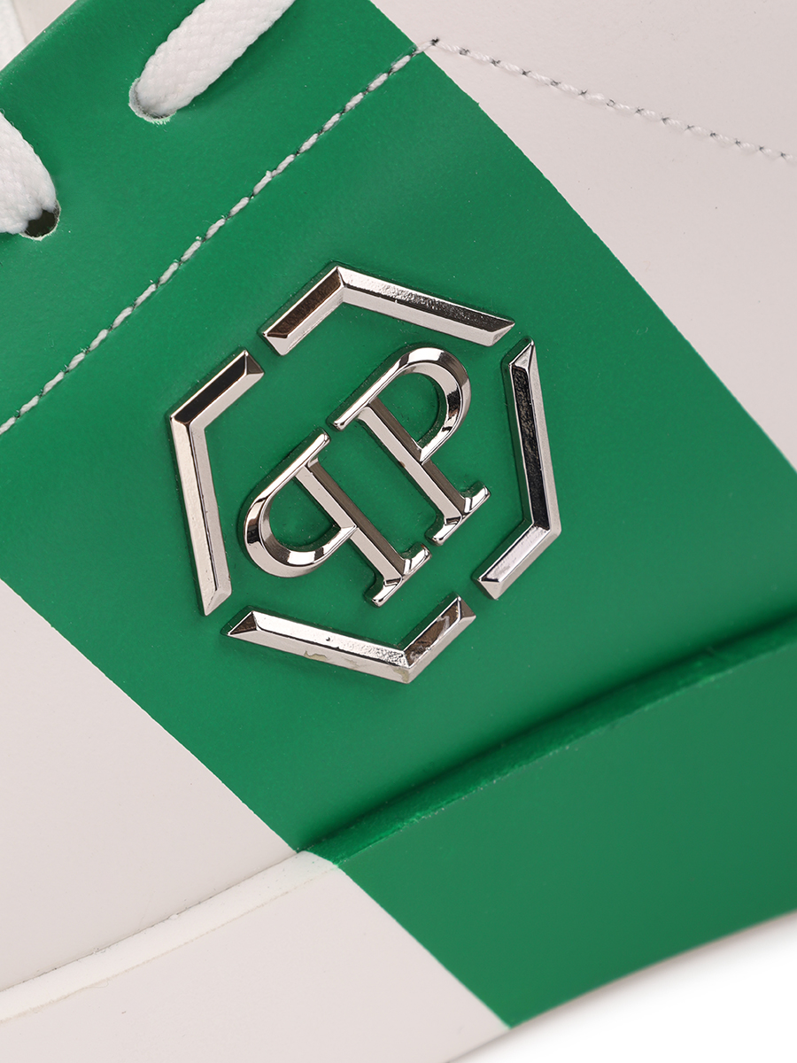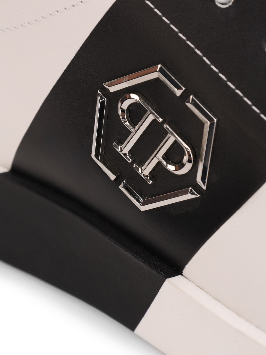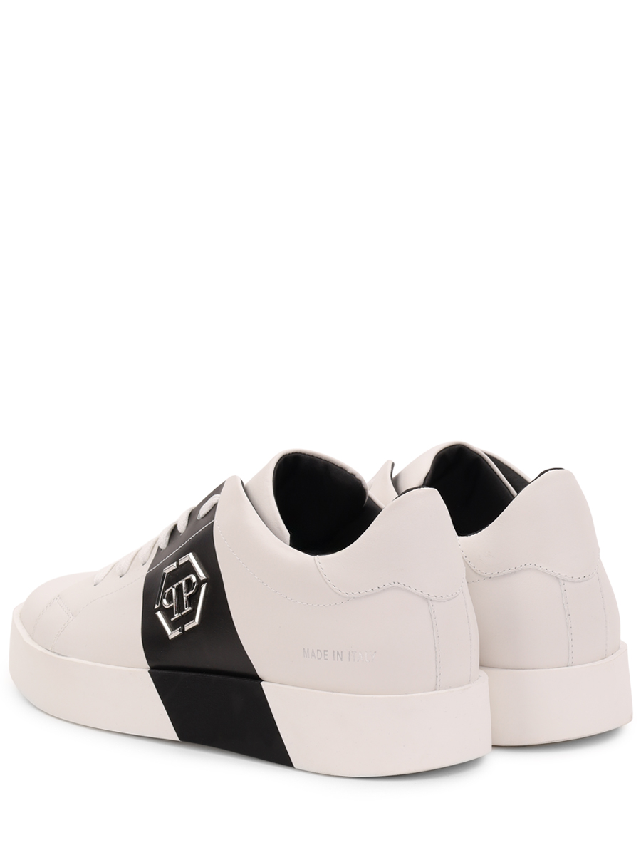 Стильные кеды от бренда Philipp Plein выполнены из мягкой натуральной гладкой матовой кожи наппа универсального белого цвета и дополнены оригинальной широкой контрастной чёрной полосой (заходящей на подошву) на боковине. Оригинальная модель с комфортной широкой колодкой, округлым миндалевидным носком, открытой белой шнуровкой и плоской формованной подошвой из прочного полиуретана в тон с нескользящим покрытием и фирменным рифлением снизу (и чёрной полосой сбоку). Фишки изделия: чёрные полосы на боковинах также декорированы объёмными культовыми металлическими лого-монограммами бренда, задник (сбоку) украшен лаконичной серебристой фирменной надписью, а сникеры дополнены контрастной чёрной внутренней отделкой из натуральной кожи телёнка.
