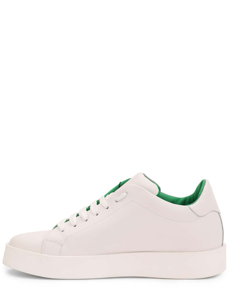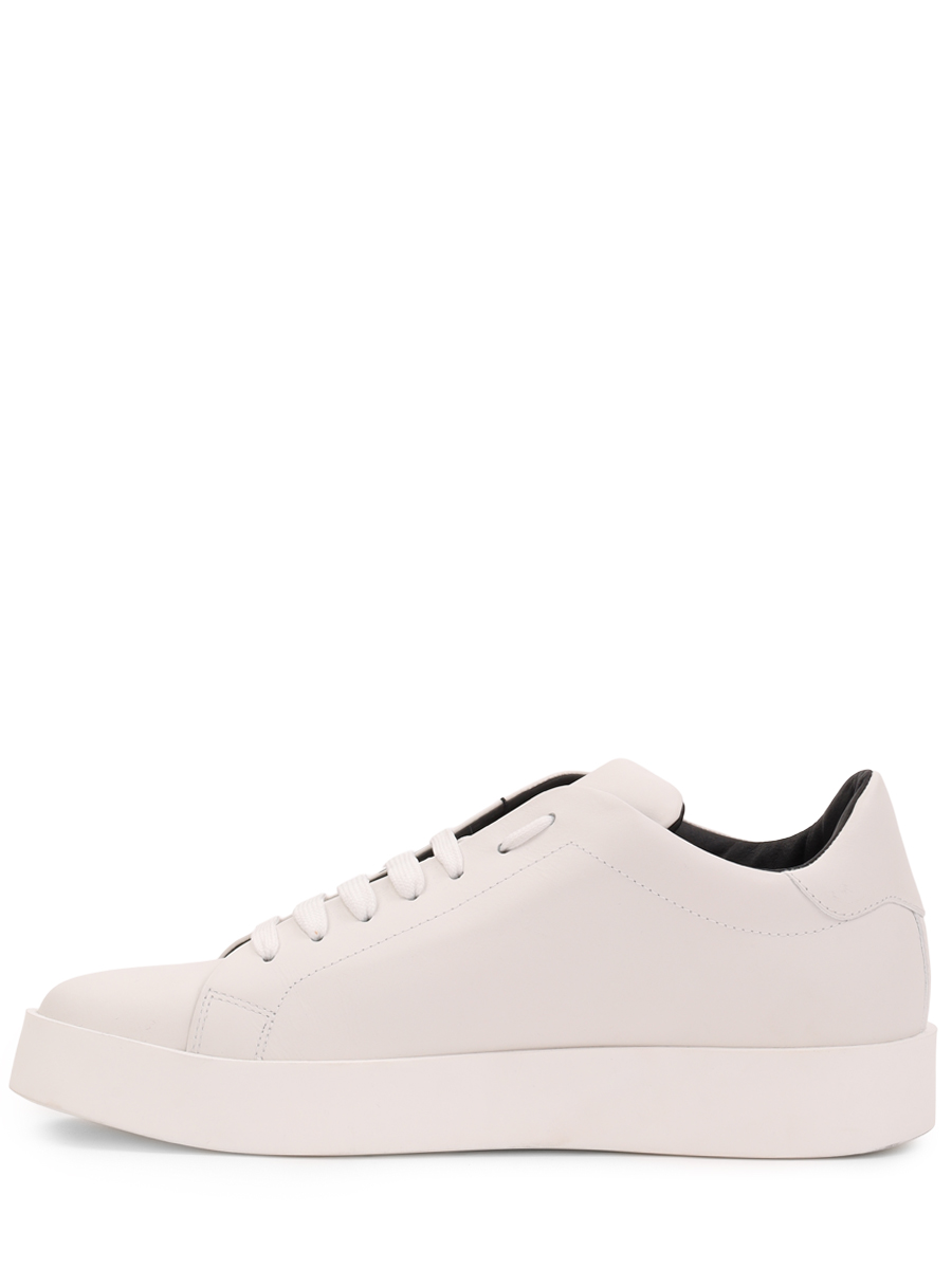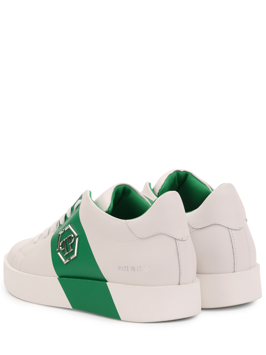 Стильные кеды от бренда Philipp Plein выполнены из мягкой натуральной гладкой матовой кожи наппа универсального белого цвета и дополнены оригинальной широкой контрастной чёрной полосой (заходящей на подошву) на боковине. Оригинальная модель с комфортной широкой колодкой, округлым миндалевидным носком, открытой белой шнуровкой и плоской формованной подошвой из прочного полиуретана в тон с нескользящим покрытием и фирменным рифлением снизу (и чёрной полосой сбоку). Фишки изделия: чёрные полосы на боковинах также декорированы объёмными культовыми металлическими лого-монограммами бренда, задник (сбоку) украшен лаконичной серебристой фирменной надписью, а сникеры дополнены контрастной чёрной внутренней отделкой из натуральной кожи телёнка.