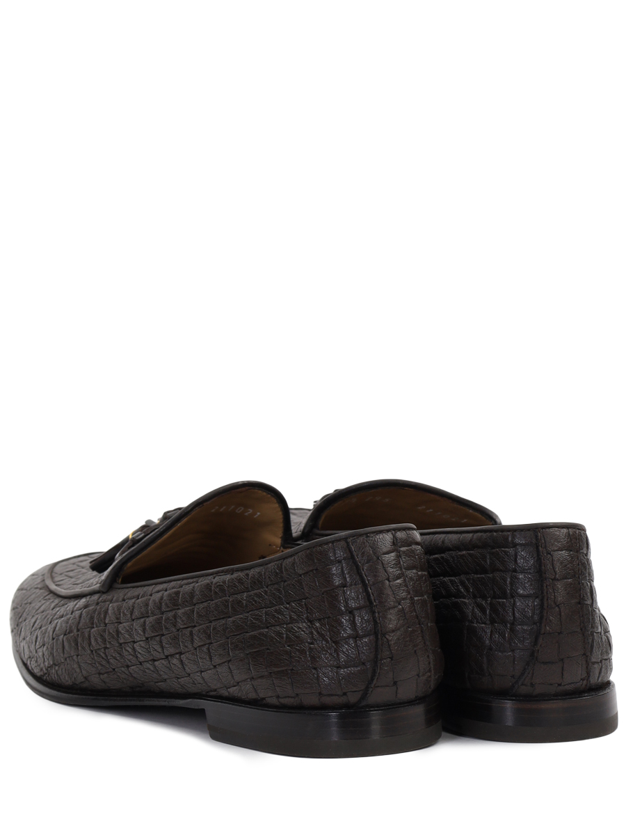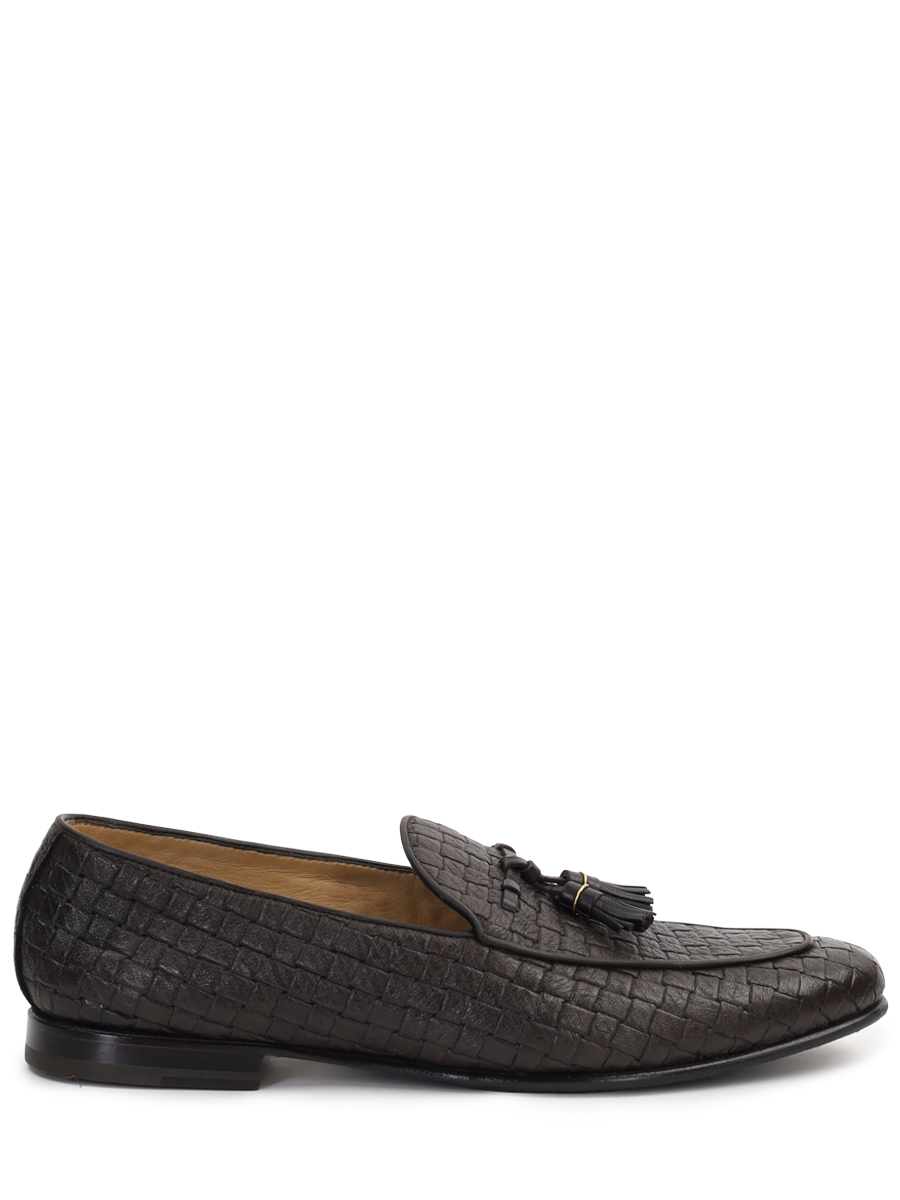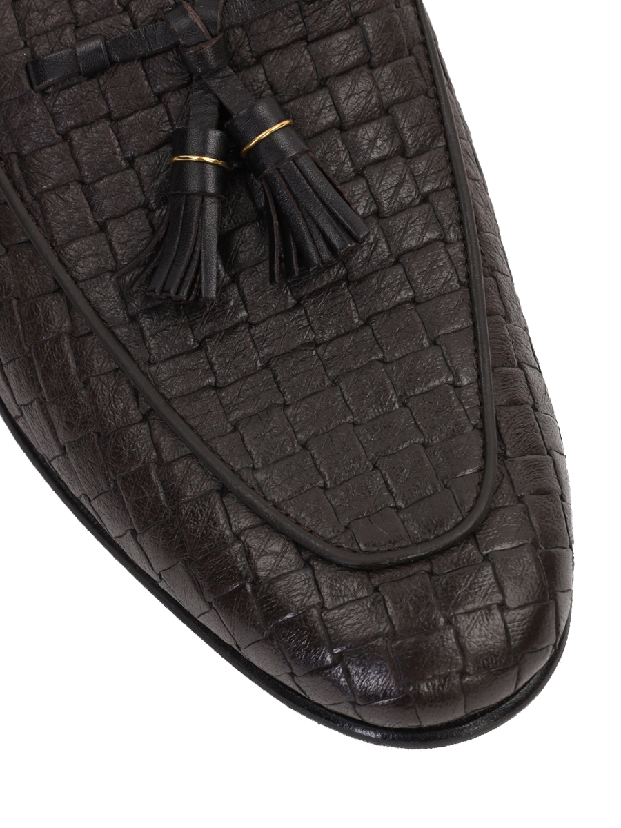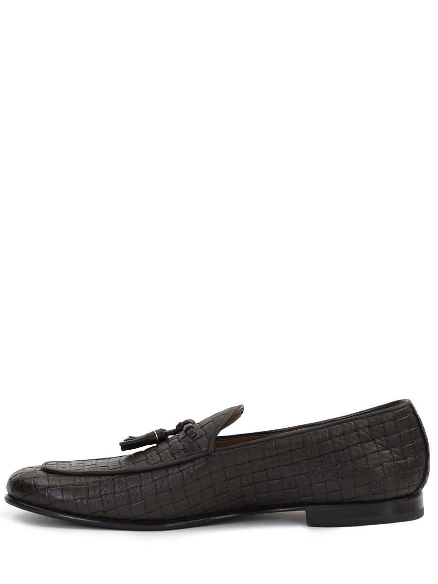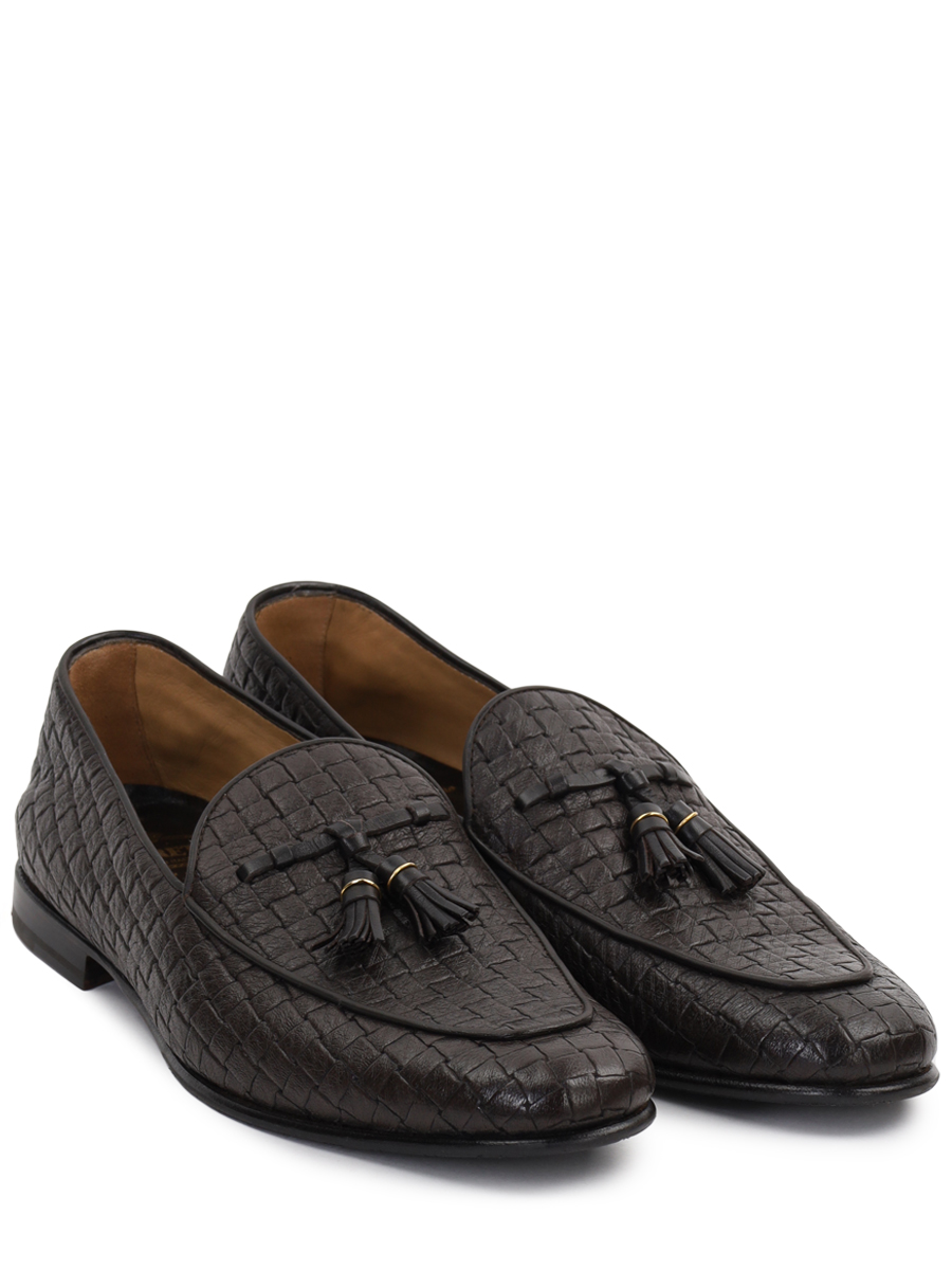 Модель изготовлена из темно-коричневой натуральной кожи с фактурным рисунком в виде шахматного переплетения, на союзке две аккуратные кисточки.