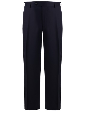 Брюки прямого кроя со стрелками, боковыми карманами и задними карманами с клапанами.