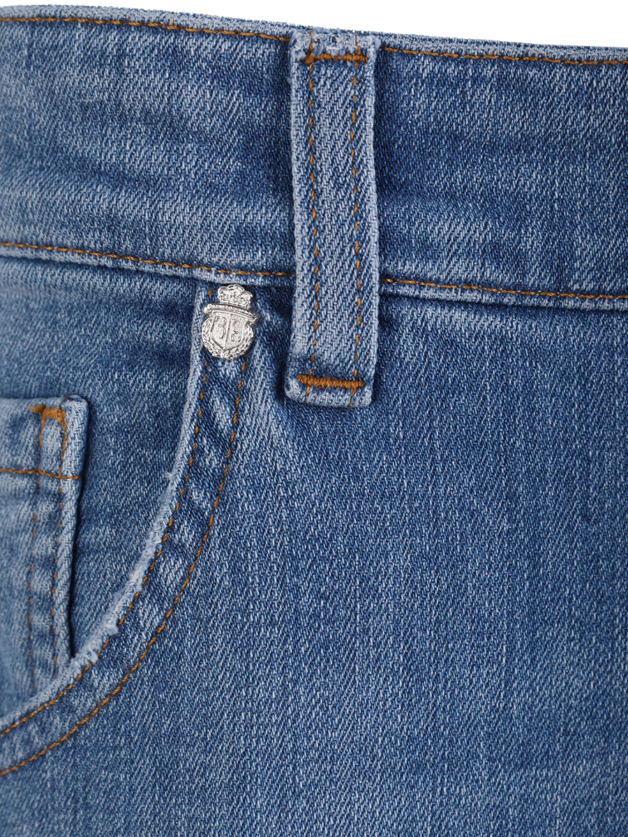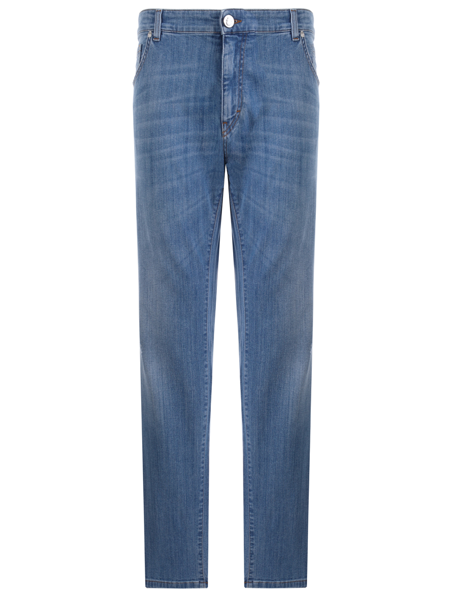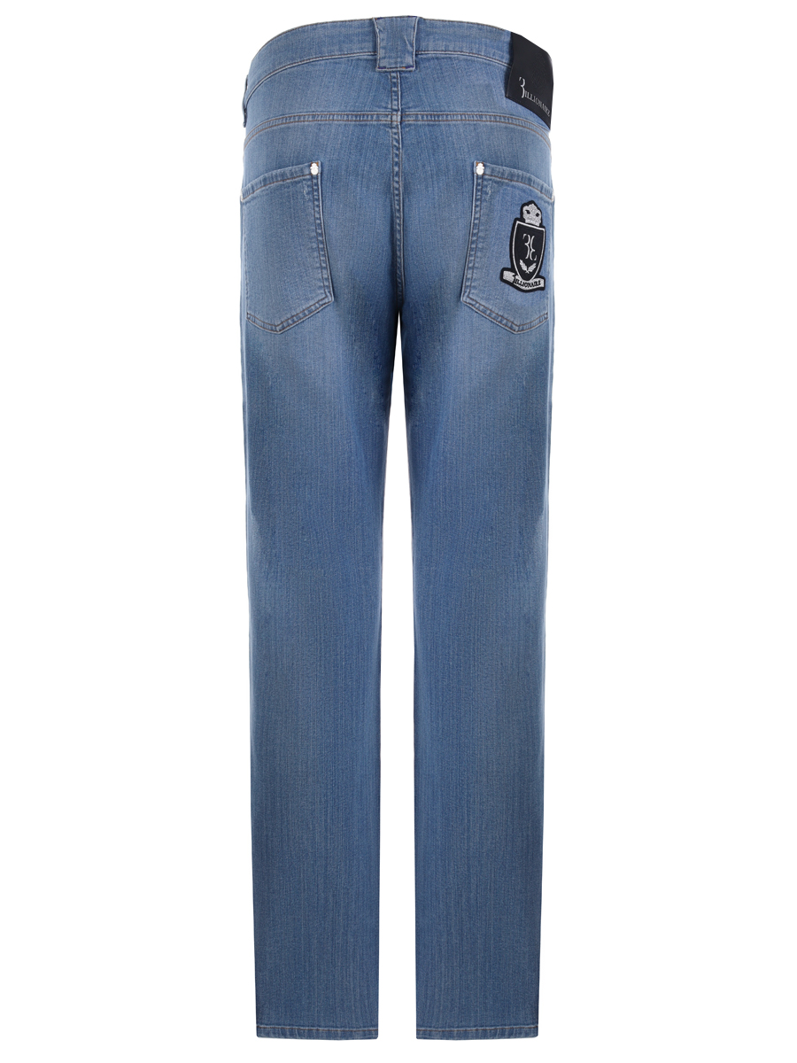 Синие джинсы из выбеленного хлопка от BILLIONAIRE. Модель прямого кроя со средней посадкой, поясом со шлевками, прорезными и накладными карманами, застежкой на молнию и пуговицу, фирменной нашивкой с логотипом бренда. Благодаря добавлению эластана джинсы немного тянутся и не стесняют движений.