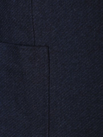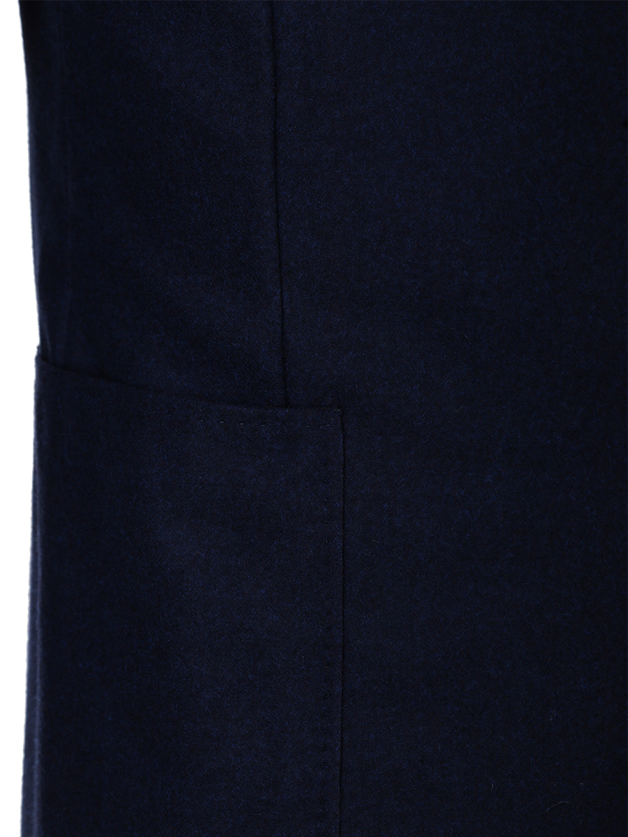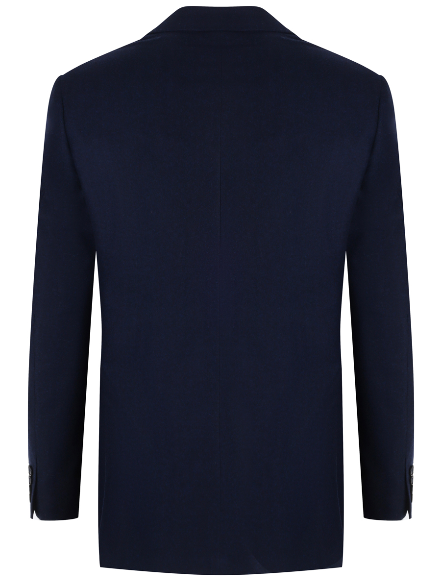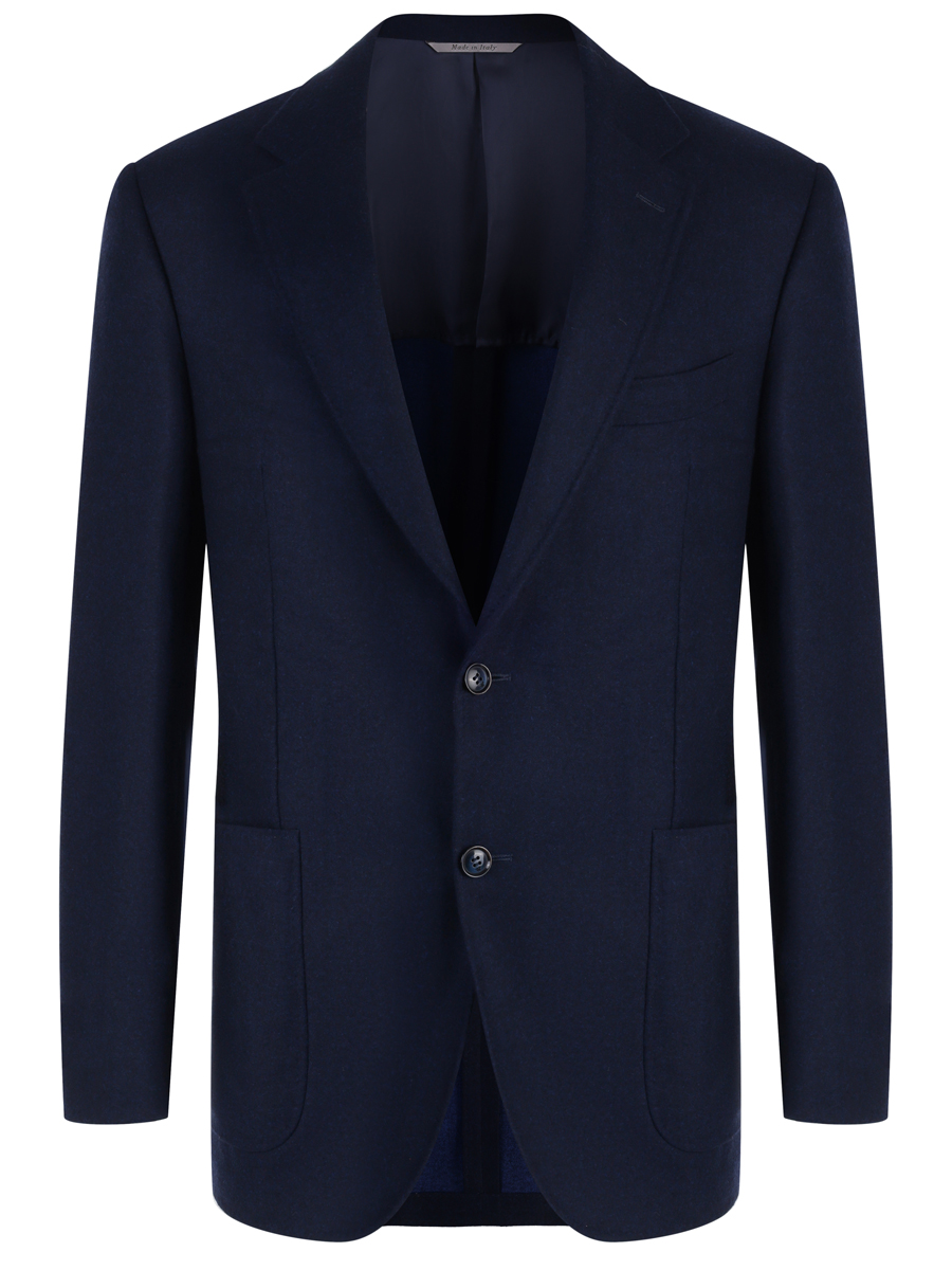 Модель прямого, однобортного кроя с двумя шлицами, накладными карманами, застегивается на две пуговицы. Изделие выполнено из шерстяного текстиля темно-синего цвета с легким меланжевым эффектом.