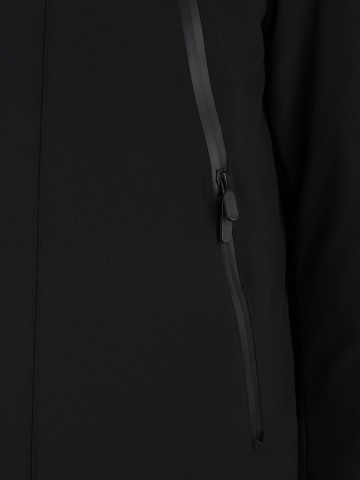 -Модель прямого кроя с длинными рукавами, воротником-стойкой, съемным капюшоном на кулиске, прорезными карманами, застежкой на молнию и ветрозащитной планкой на кнопках.