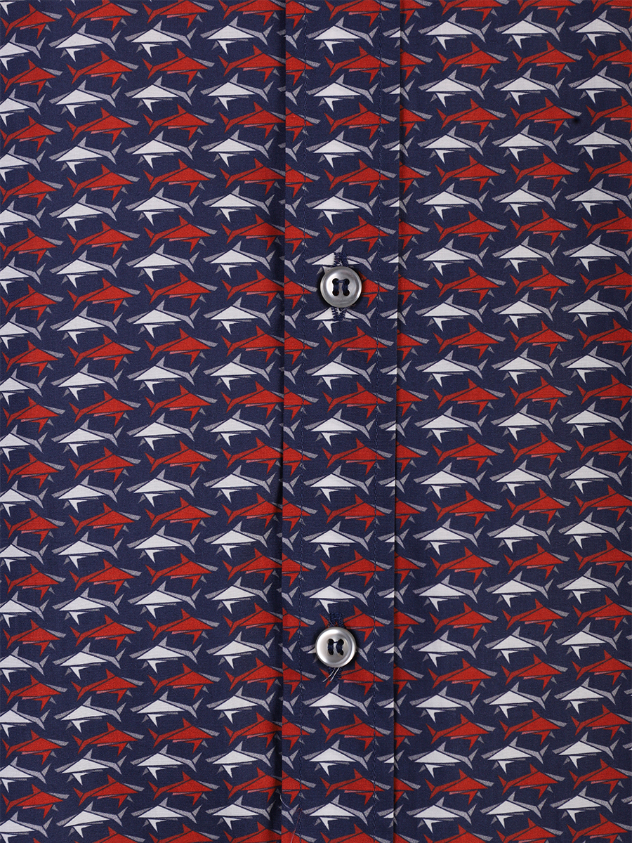Эта модель изготовлена из хлопкового текстиля с принтом-паттерном в виде красных и белых акул на темно-синем фоне. Дизайнеры бренда не зря выбрали такой рисунок - акула выступает эмблемой и отличительным знаком марки.