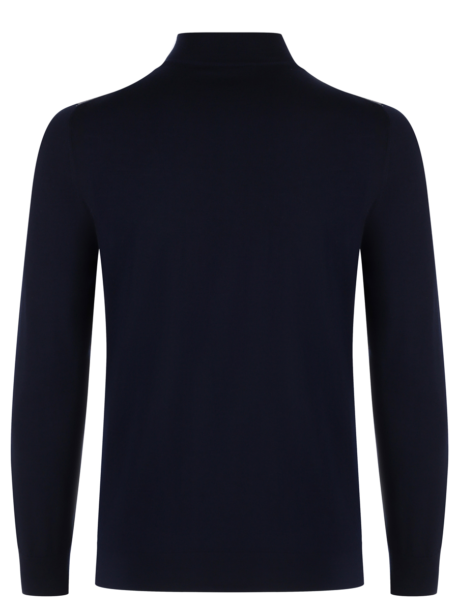Модель с воротником-стойкой на молнии выполнена из тонкой шерстяной пряжи в трехцветной гамме и украшена декором в виде вывязанного паттерна с шестиугольным узором.