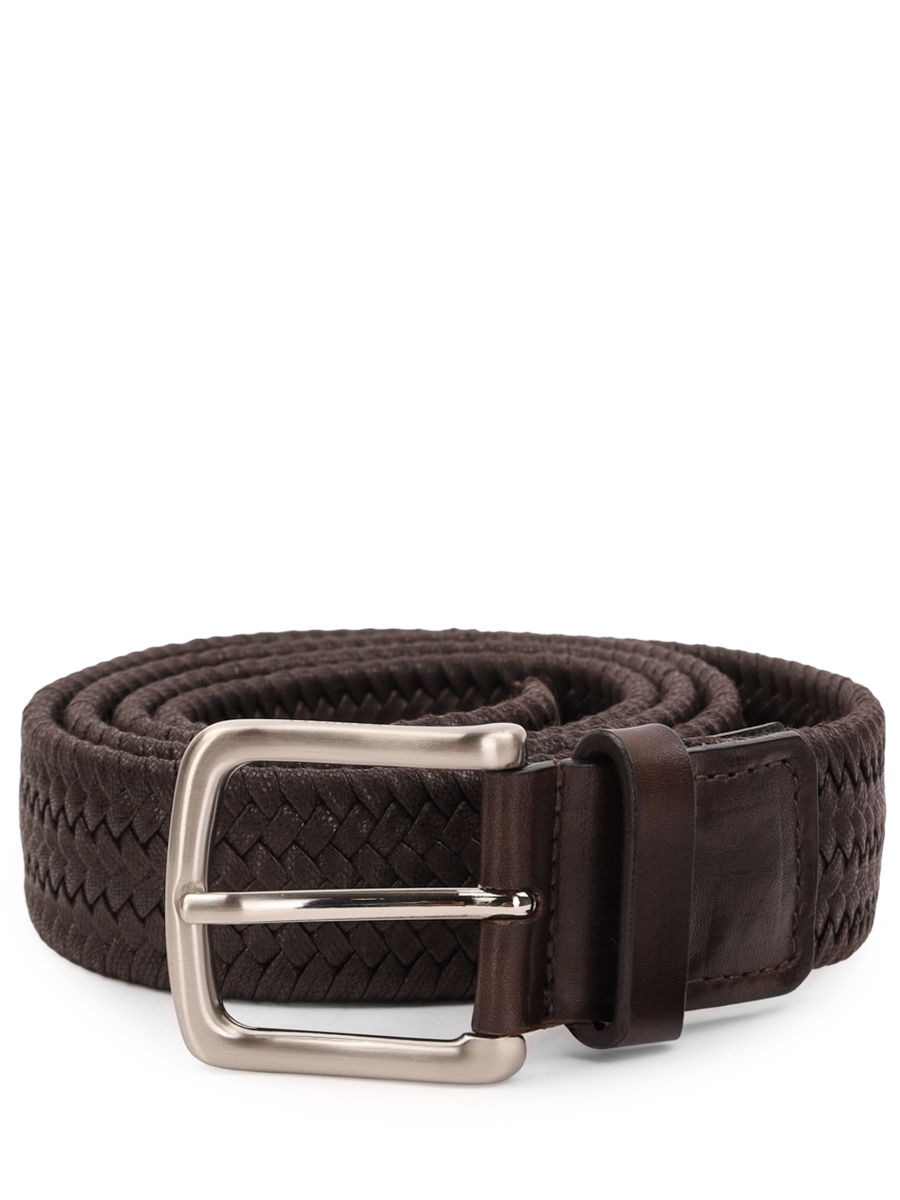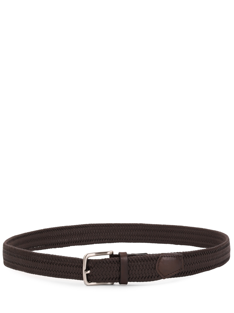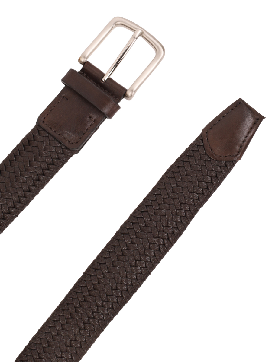 Для изготовления коричневого ремня использовали прочные фактурные шнуры. Их плотно переплели, сформировав графичный узор, а концы укрепили накладками из матовой кожи. Регулируемый аксессуар с прямоугольной лаконичной пряжкой цвета состаренной латуни органично впишется в летний образ.