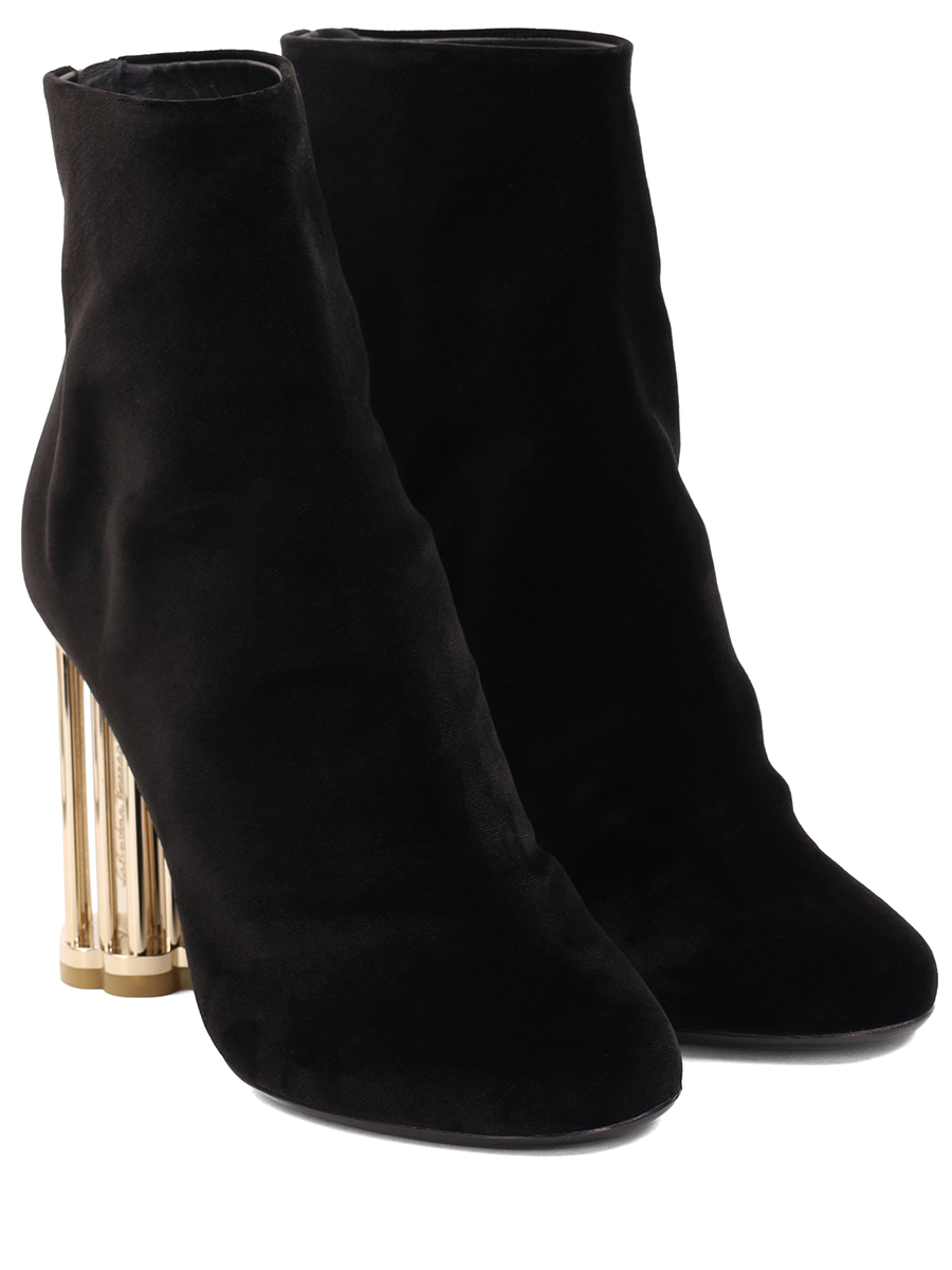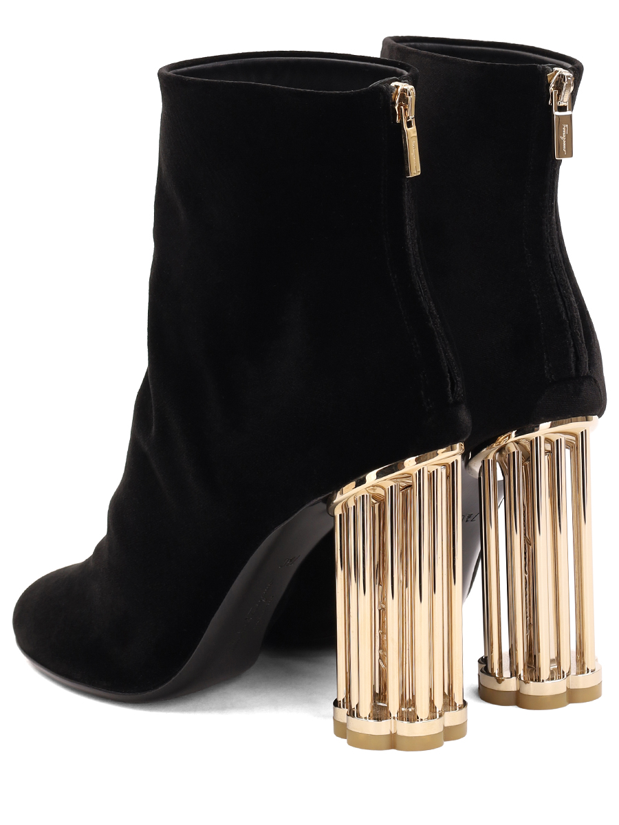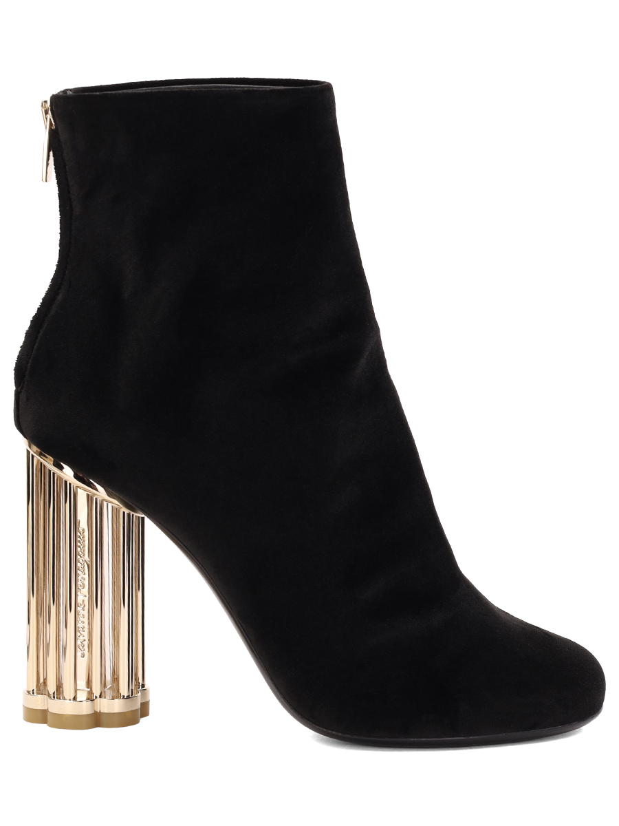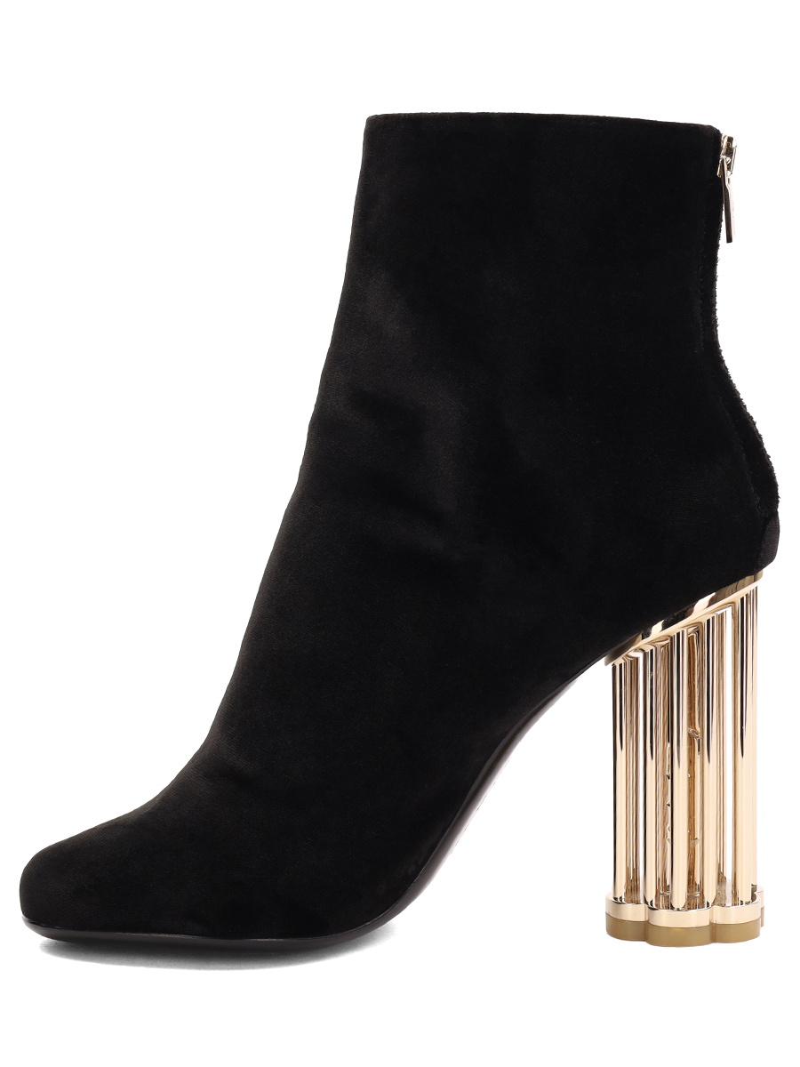 Бархатные, текстильные ботильоны на фигурном, высоком каблуке.