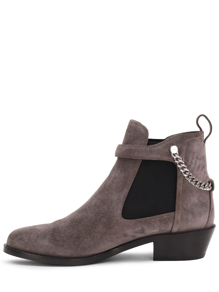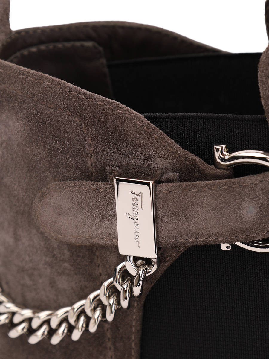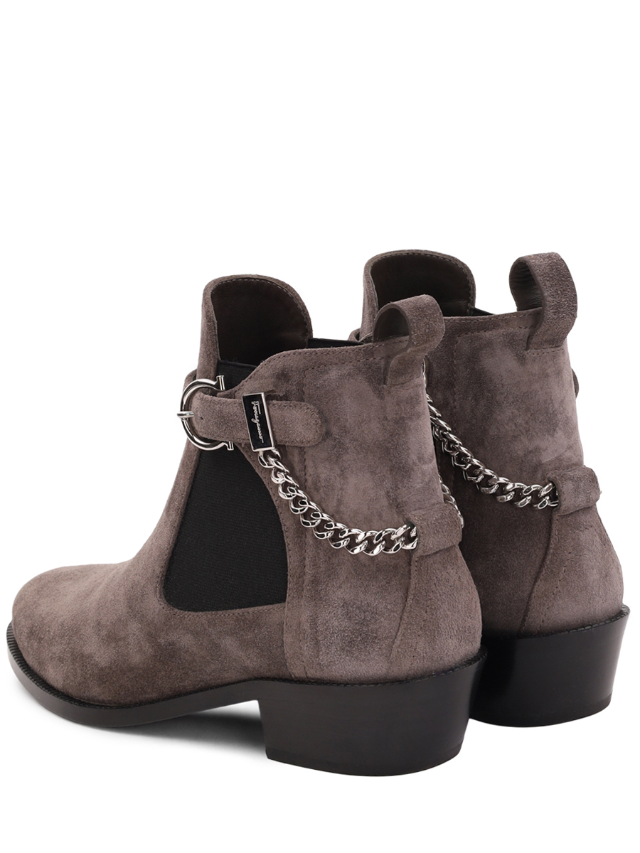 Ботинки-казаки с элементами челси от Salvatore Ferragamo. Миндалевидный носок, цепь, серебристая пряжка, петля для подтягивания сзади и массивный каблук средней высоты.