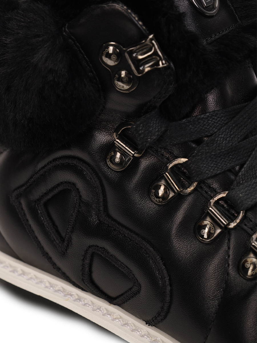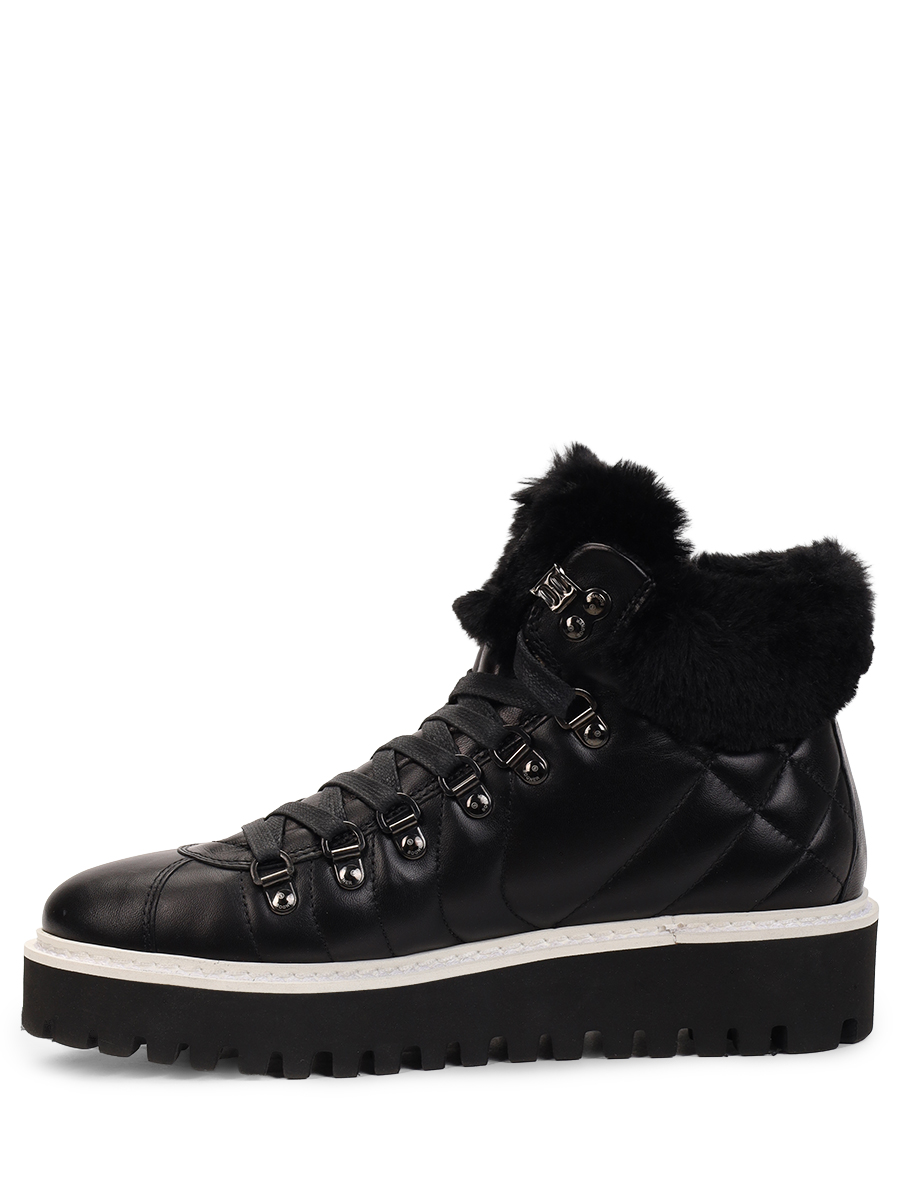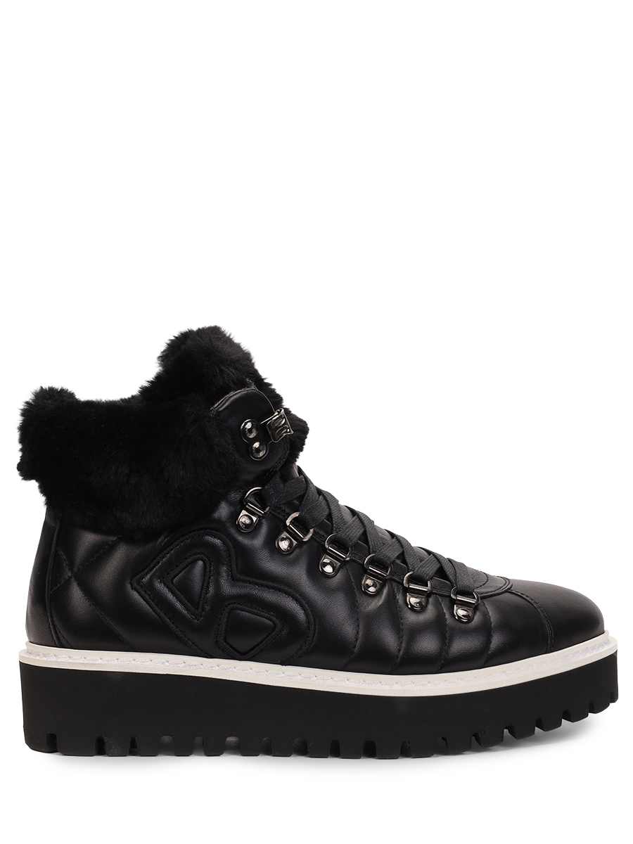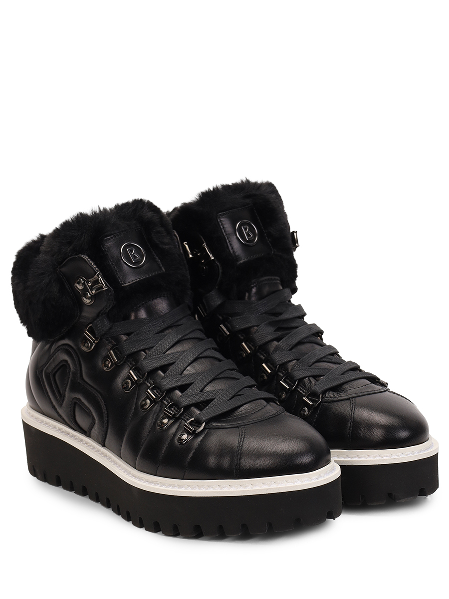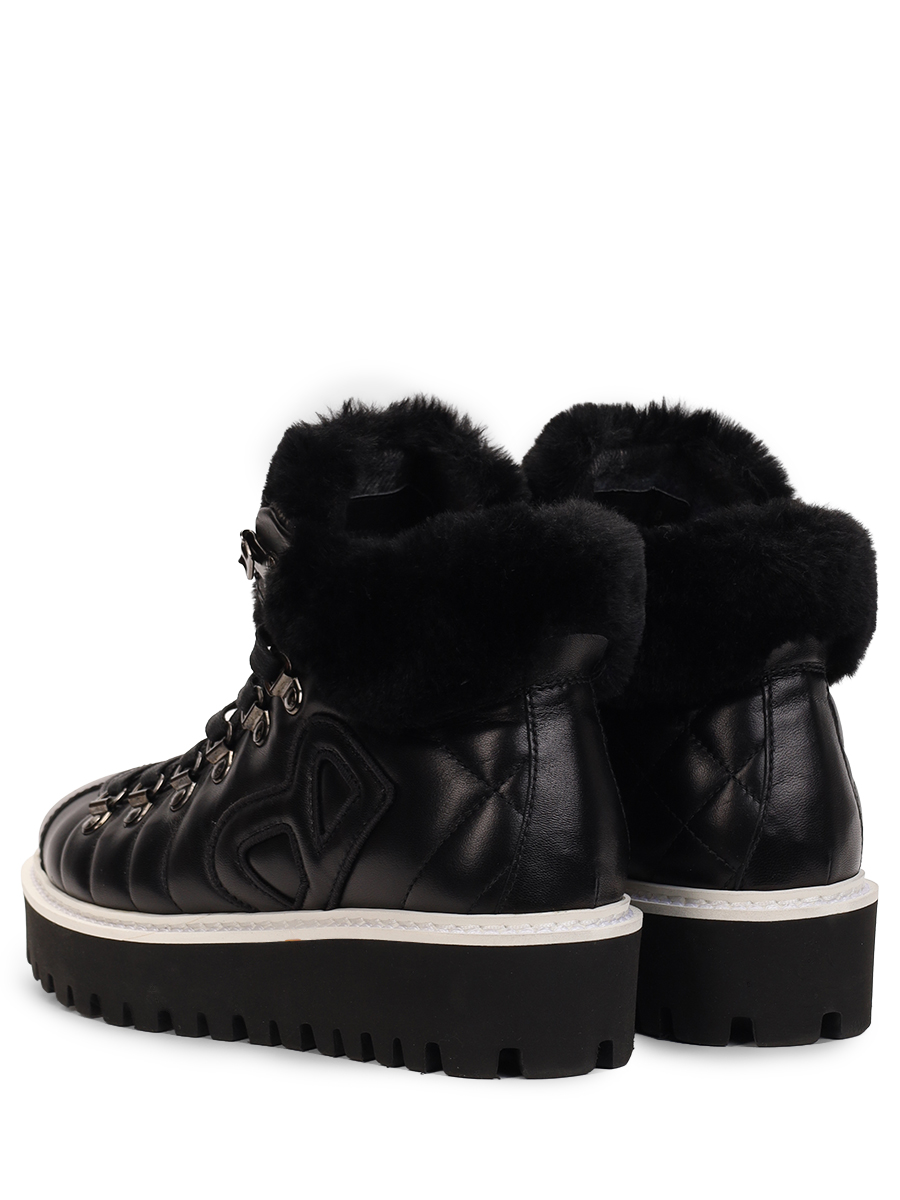 Черные ботинки из стеганой кожи от BOGNER. Модель с округлым мысом, толстой резиновой подошвой с протектором, функциональной шнуровкой, объемным кантом из экомеха на голенище и внутренней отделкой из шерстяного текстиля.