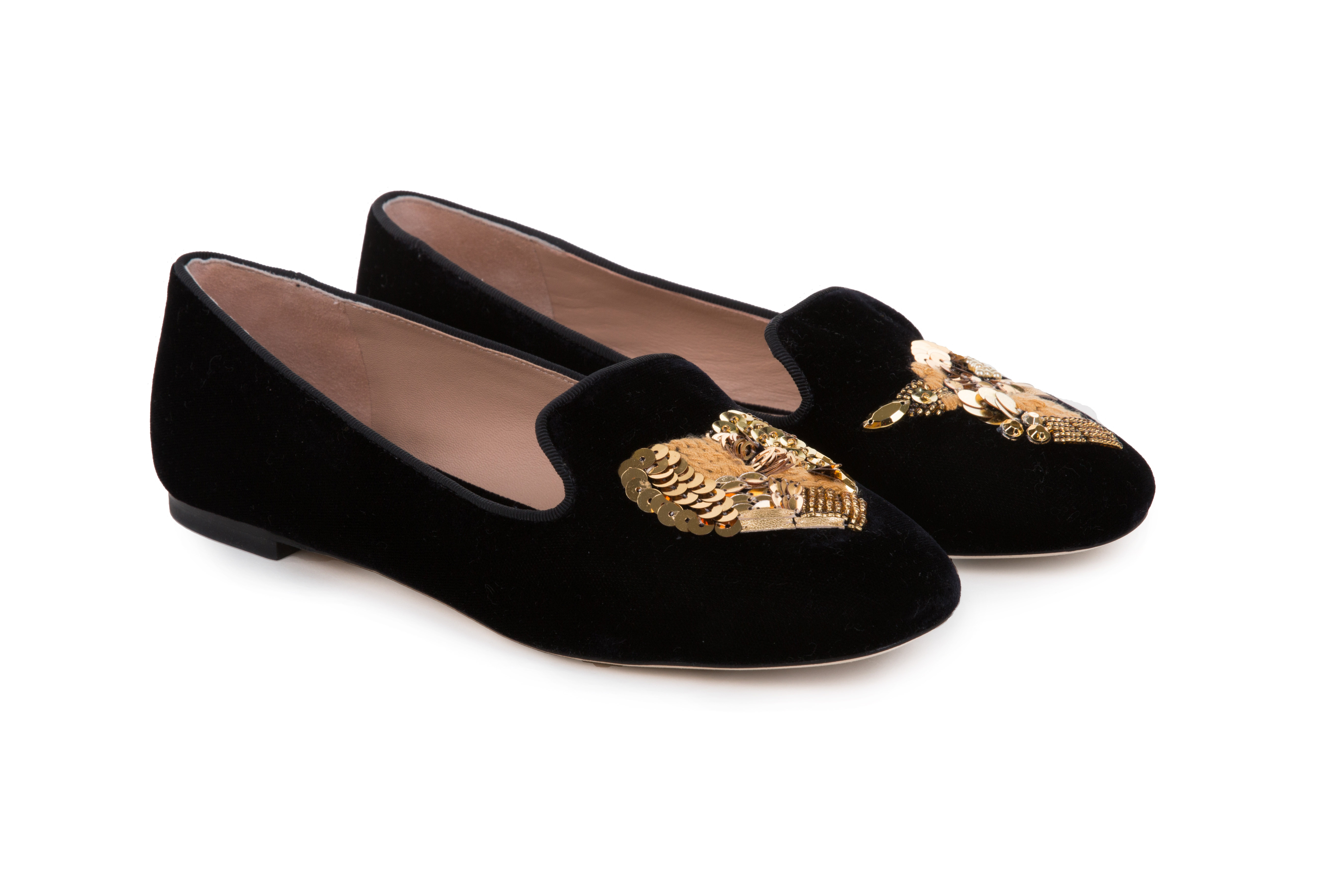 Слиперы на невысоком каблуке, с круглым носком и расположенной на нем вышивкой с пайетками.