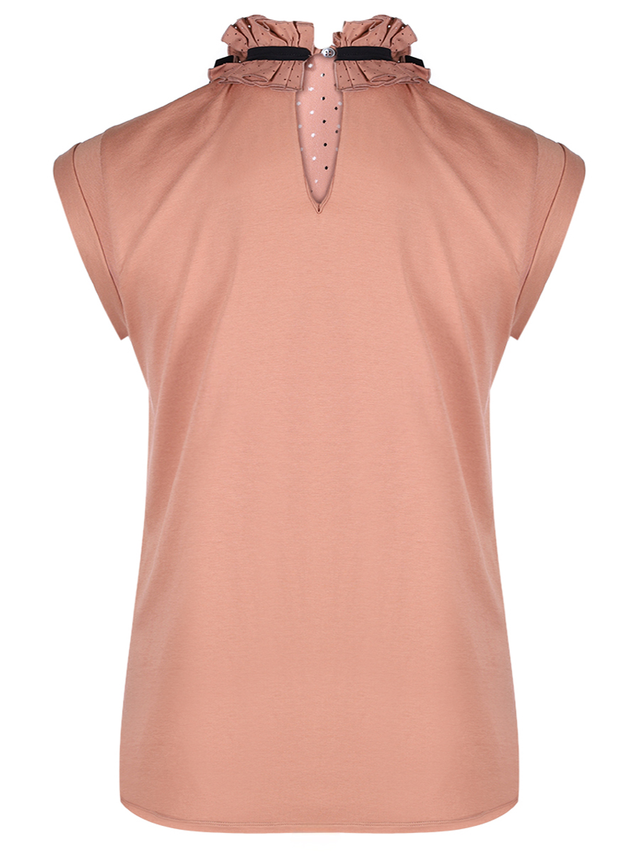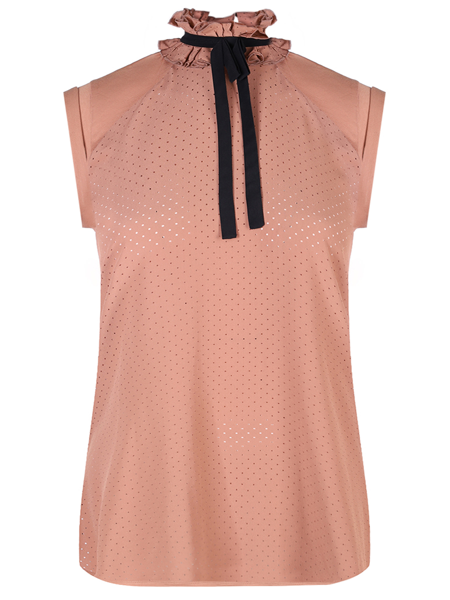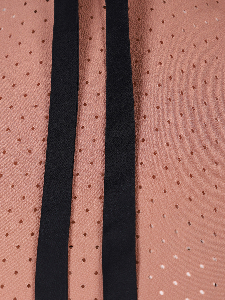 Блуза N 21 из перфорированного смесового хлопка с воротником-жабо и контрастной лентой представляет собой идеальное сочетание дерзкого дизайна и комфорта. Полуприлегающий прямой силуэт с короткими рукавами подчеркивает женственность, а перфорация добавляет образу легкость и воздушность. Воротник-жабо с контрастной лентой становится стильным акцентом, демонстрируя фирменную эстетику бренда — баланс между романтикой и современностью.