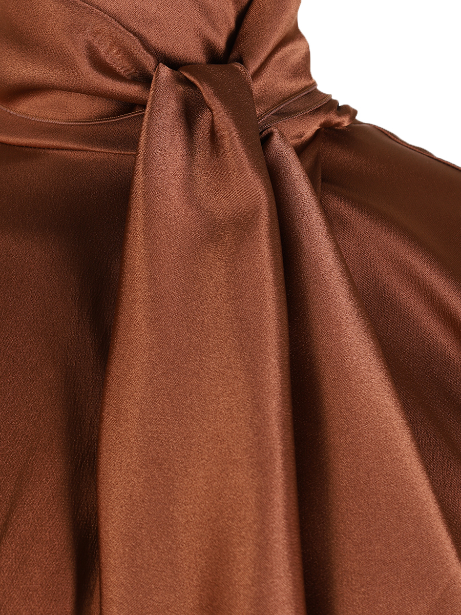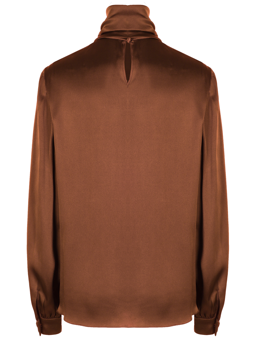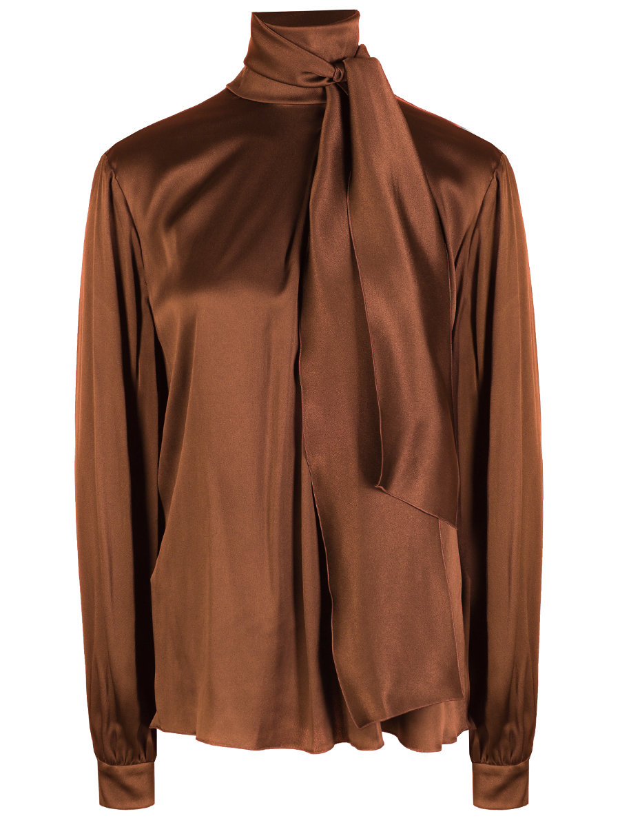 Коричневая блуза из тонкого струящегося атласа с деликатным блеском от ALBERTA FERRETTI. Модель свободного кроя с длинными рукавами, манжетами и воротником-аскот, концы которого формируют крупный бант. Блуза прекрасно дополнит повседневный образ с лаконичными брюками или юбками.