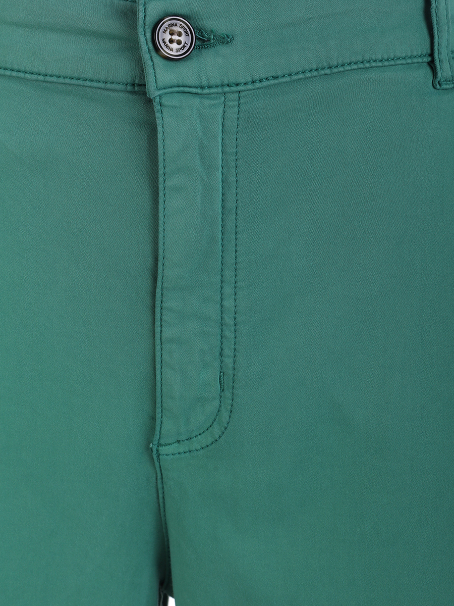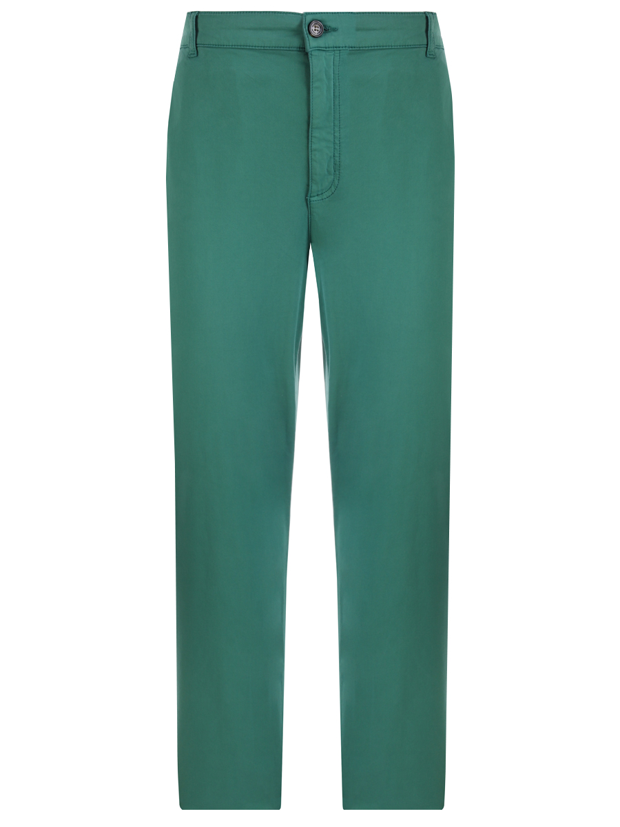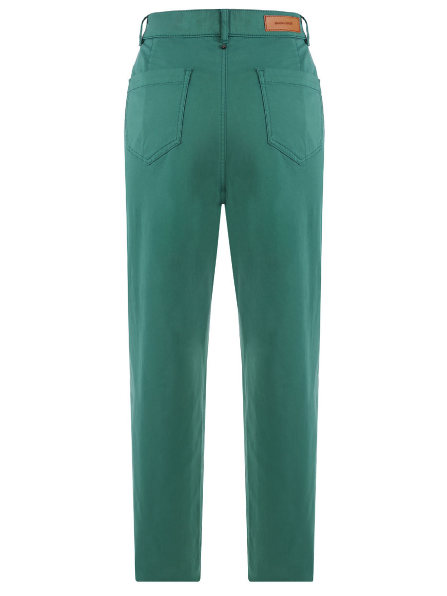 Брюки из хлопка от MARINA RINALDI. Модель прямого кроя со средней посадкой, поясом со шлевками, прорезными и накладными карманами, застежкой на молнию и пуговицу, фирменной нашивкой с логотипом бренда. Благодаря добавлению эластана брюки немного тянутся и не стесняют движений.