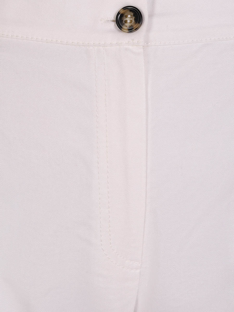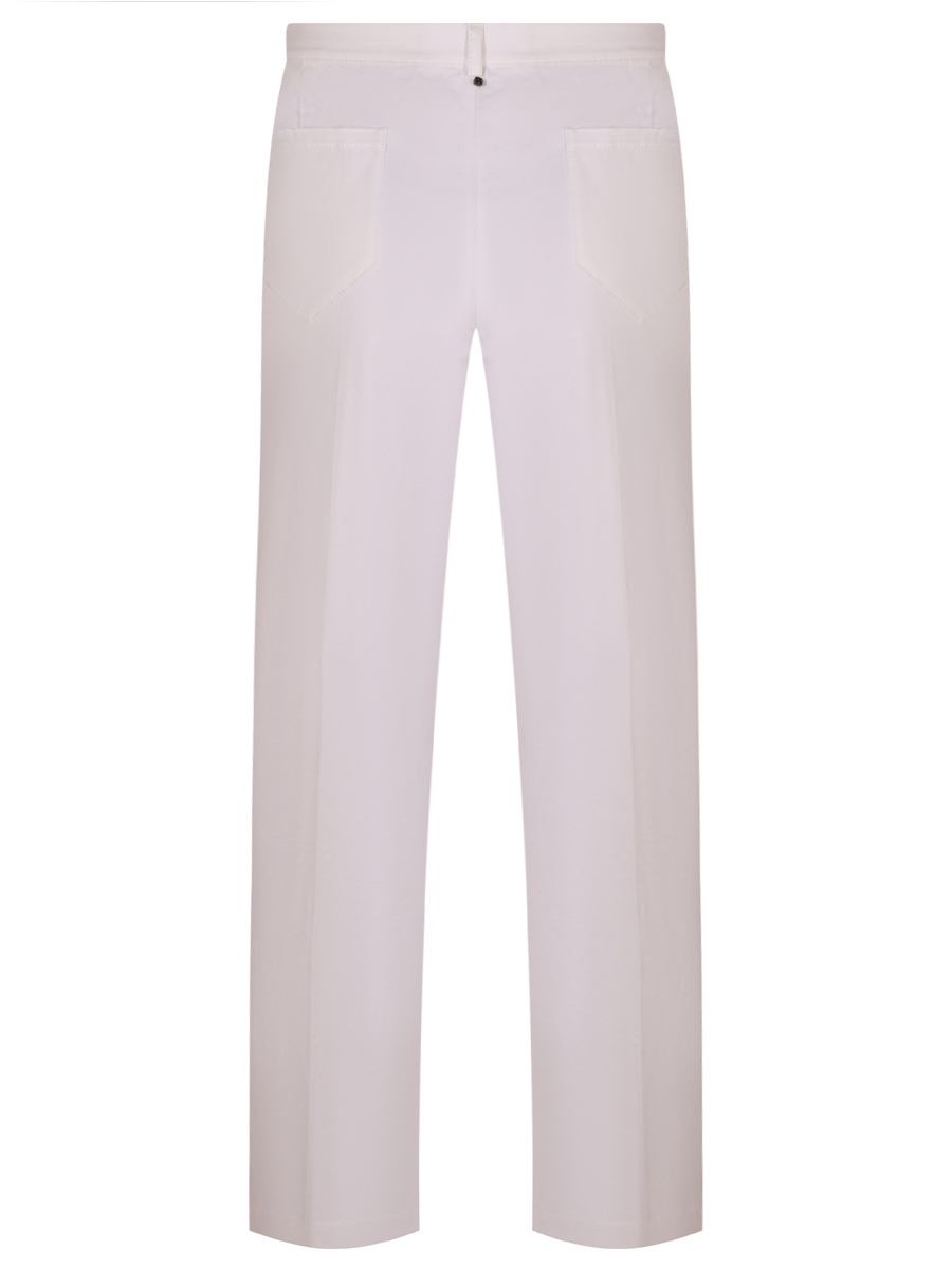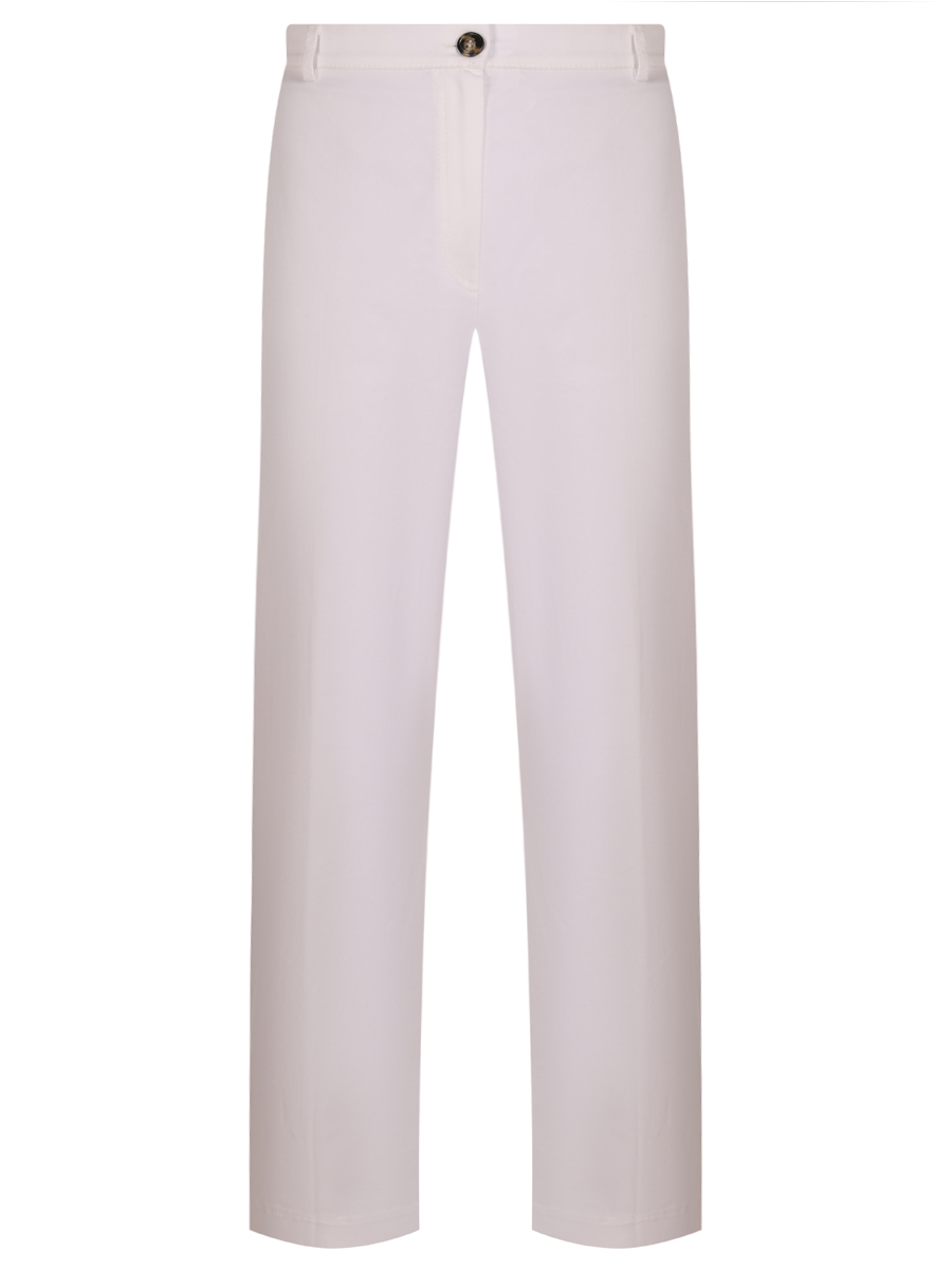 Белые брюки MARINA RINALDI из высококачественного хлопка — воплощение летней элегантности с итальянским чувством стиля. Прямой крой со средней посадкой и графичными стрелками визуально удлиняет ноги, создавая стройный силуэт. Пояс со шлевками и накладные карманы сзади добавляют классическую строгость, а застежка на молнию и пуговицу обеспечивает удобство. MARINA RINALDI демонстрирует искусство создания универсальной одежды: эти брюки одинаково хорошо сочетаются с шелковыми блузами для делового образа, льняными рубашками для прогулок или облегающими топаами для вечернего выхода.