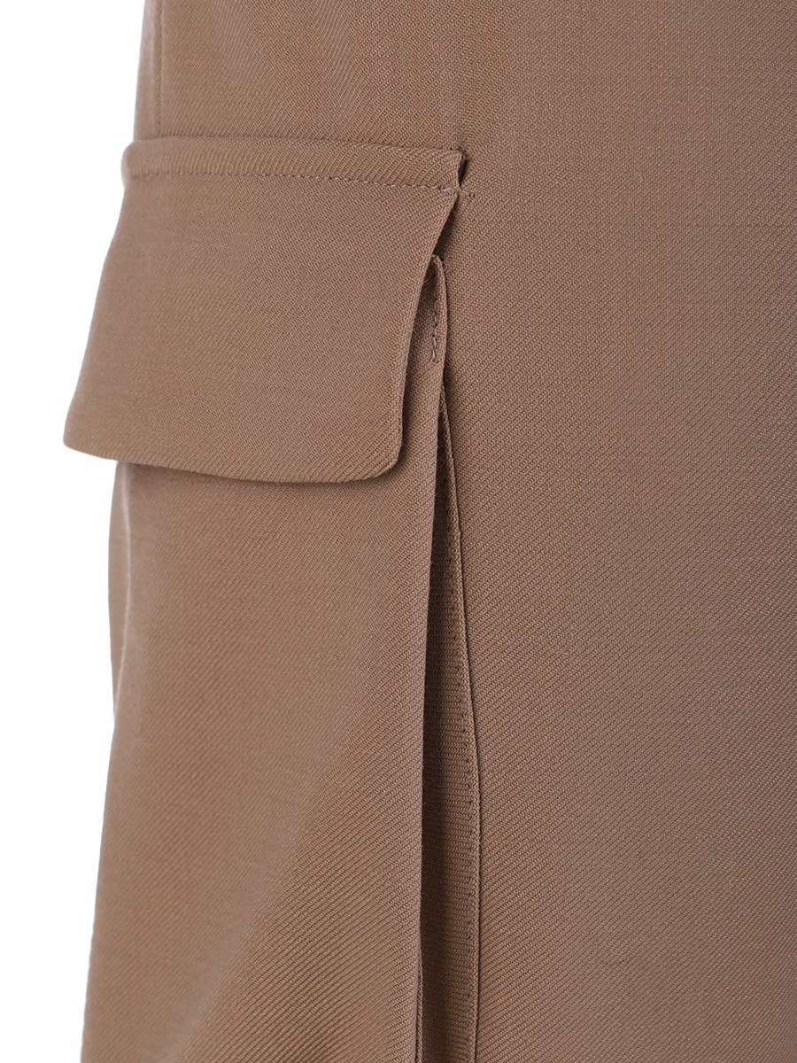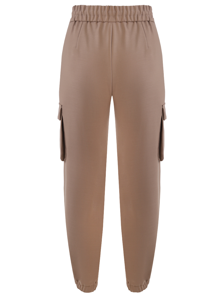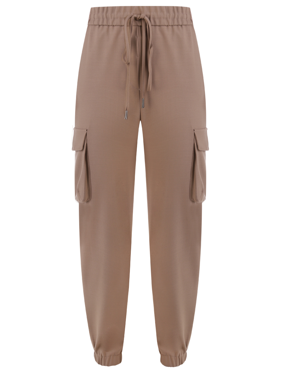 Женские брюки модели Teo от бренда ANTONELLI FIRENZE бежевого цвета. Они имеют свободный крой с эластичными манжетами в области щиколоток, что придает им немного спортивный вид. Брюки оснащены эластичным поясом с дополнительной регулировкой на шнурке, что обеспечивает удобную посадку и возможность подгонки по фигуре. Особенностью данной модели являются накладные карманы с клапанами на бедрах, которые придают брюкам стиль "карго". Из-за своей утилитарной детализации и цвета, эти брюки могут быть как частью повседневного, так и более стильного гардероба в зависимости от того, с чем их сочетать.