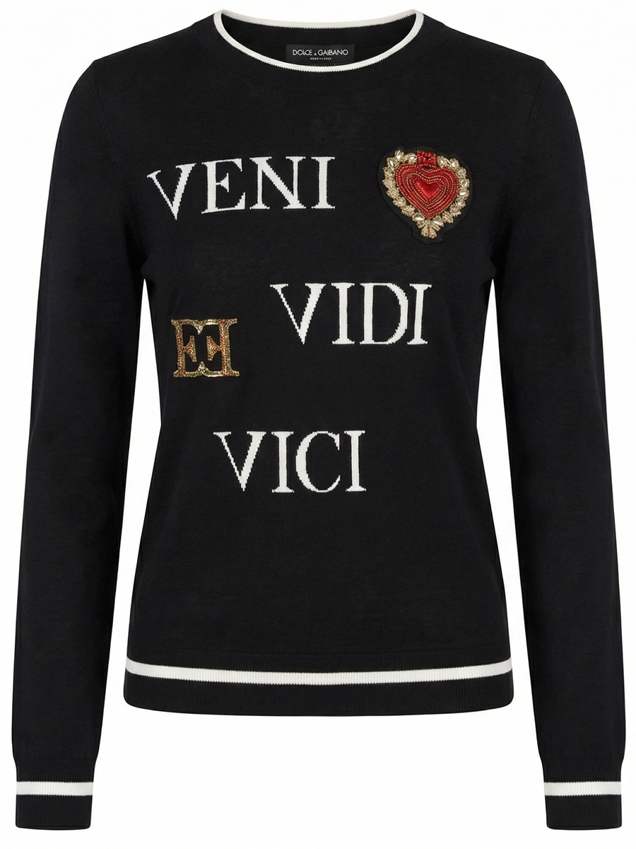 Лейтмотивом коллекции было сердце, как дань уважения истории бренда: именно в форме него был флакон первого аромата Escada. На этом черном пуловере из тонкой нежной шерсти virgin знаковый элемент вышили красными и золотистыми нитями, а сопроводили белой надписью «Veni, Vidi, Vici». Эта вещь будет хорошо смотреться и с джинсами, и с юбкой-карандаш.