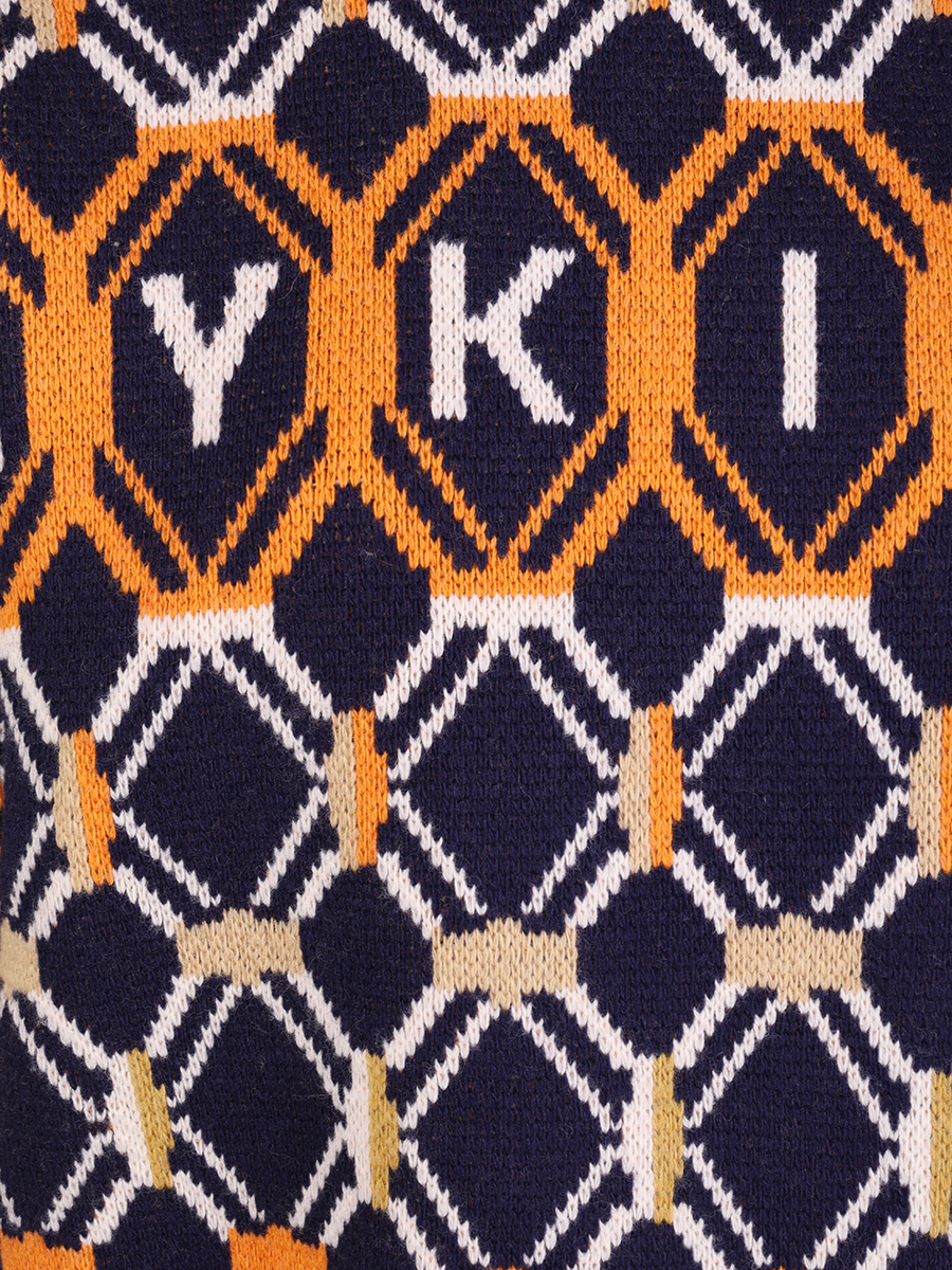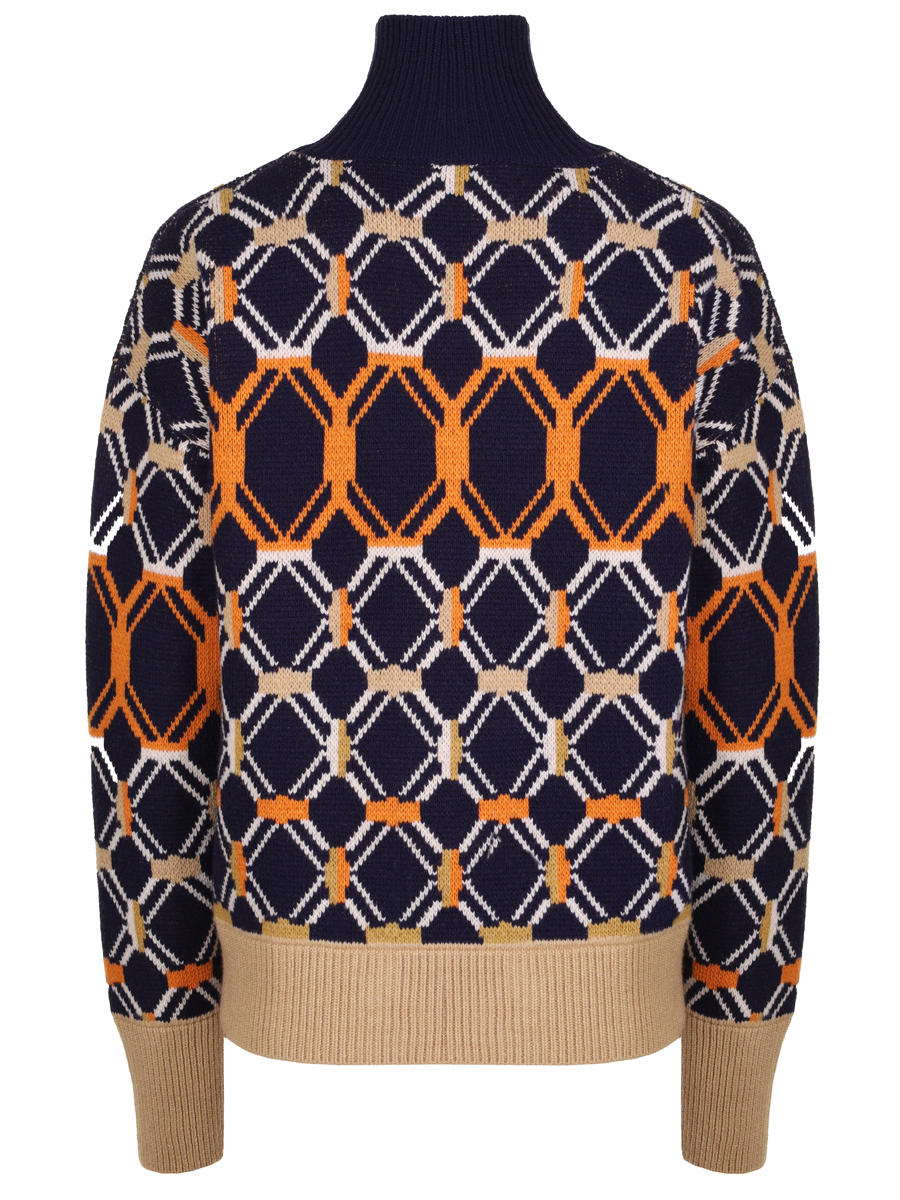 Темно-синий свитер с ярким геометрическим орнаментом из мягкой шерсти от SONIA RYKIEL. Модель свободного кроя со спущенной линией плеча, длинными рукавами, рельефными манжетами, поясом и воротником-стойкой, крупным жаккардовым логотипом спереди.