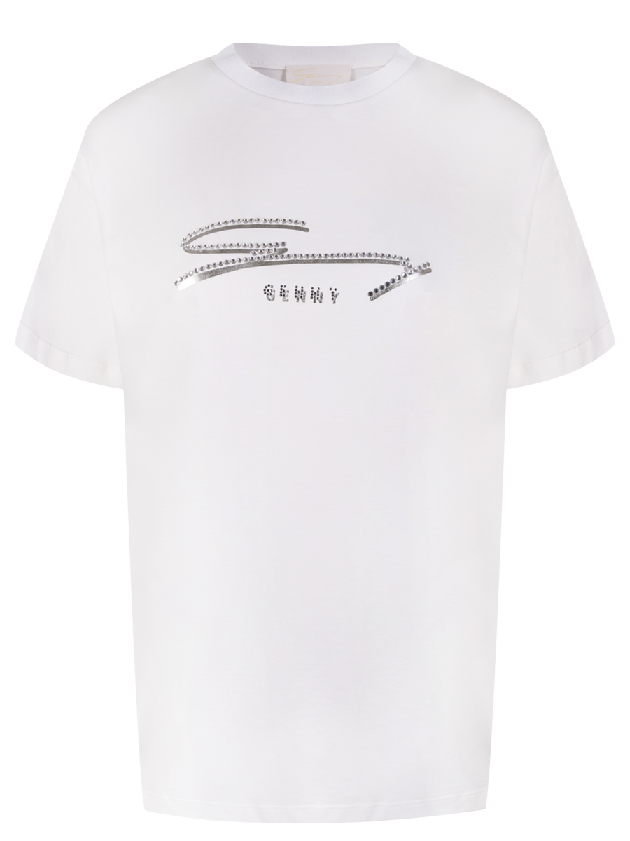 Белая футболка из мягкого хлопка от GENNY. Модель прямого кроя с короткими рукавами, круглым вырезом горловины и логотипом со стразами на груди. Футболка комфортно садится по фигуре и не ограничивает свободу движений.