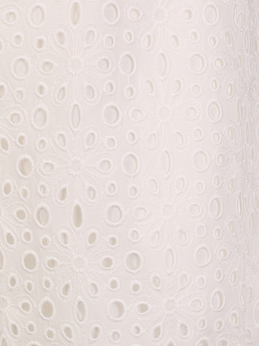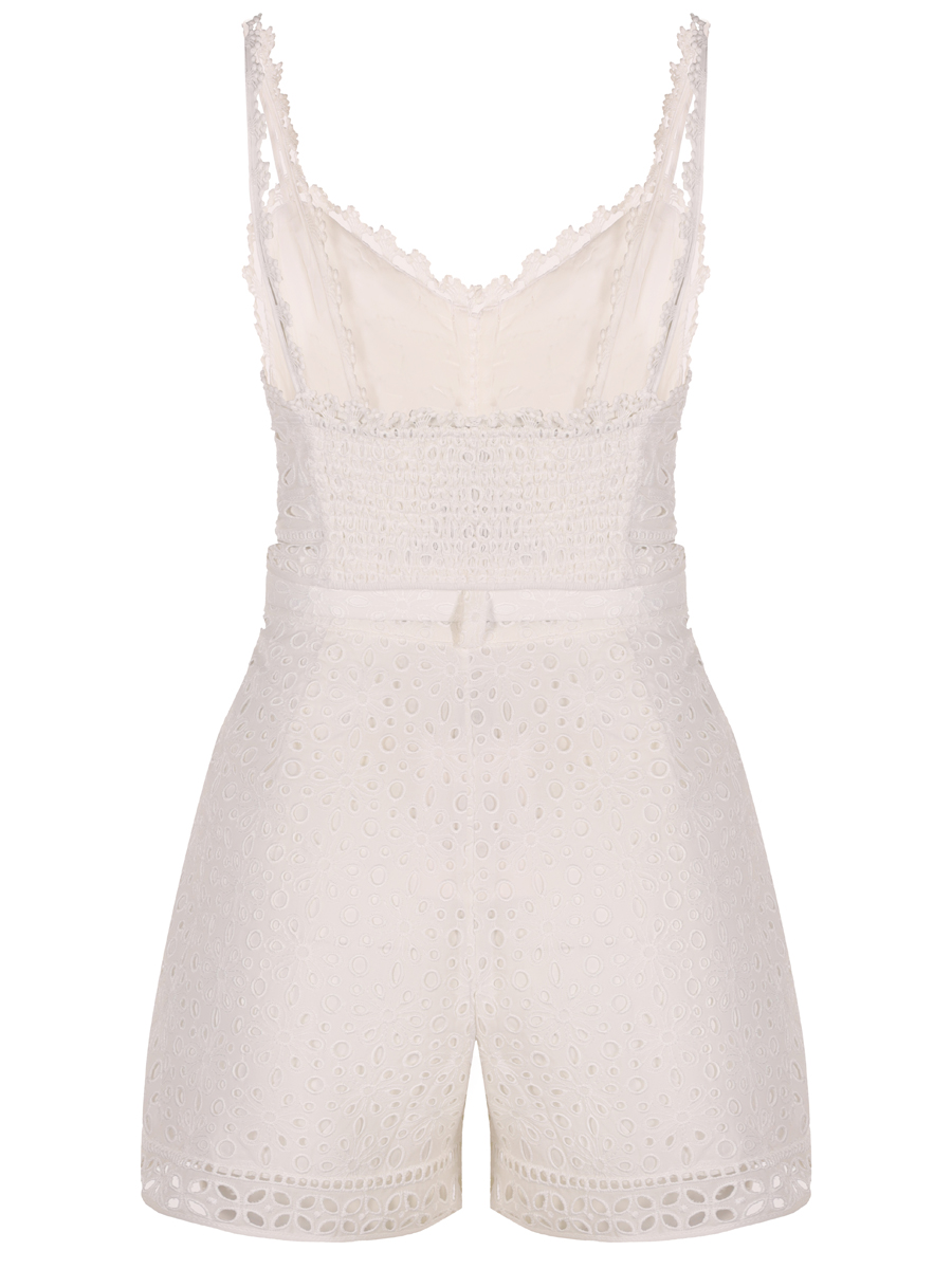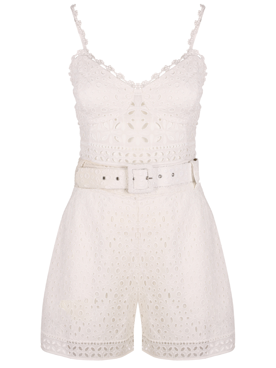 Белый костюм из ажурного хлопкового кружева broderie anglaise с цветочным мотивом от CHARO RUIZ. Укороченный топ с узкими бретелями, треугольными чашками лифа и эластичной вставкой на спине. Шорты с высокой посадкой, поясом со шлевками и широким ремнем с крупной квадратной пряжкой в тон, который подчеркивает талию и структурирует силуэт.