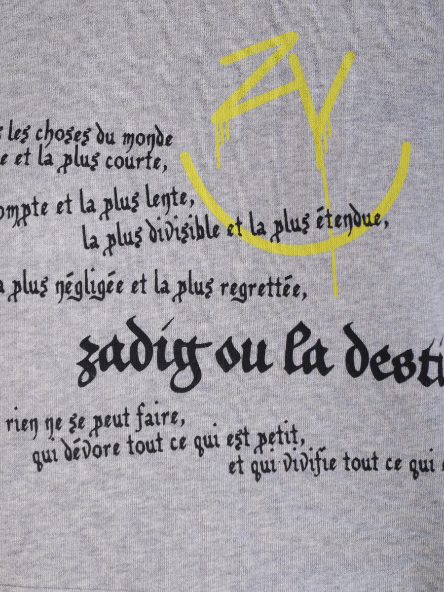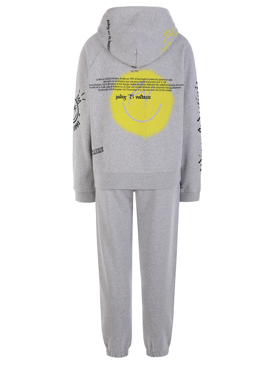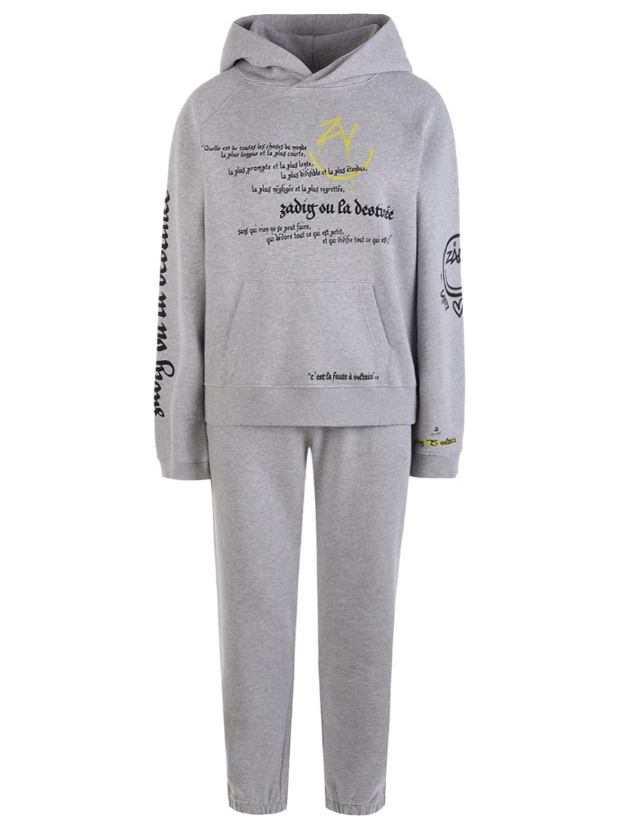 Серый костюм из мягкого трикотажа на основе хлопка с начесом от ZADIG VOLTAIRE. Худи свободного кроя с длинными рукавами-реглан, эластичными манжетами и поясом, капюшоном, накладным карманом-кенгуру и контрастным брендовым принтом. Джоггеры прямого силуэта с эластичным поясом на кулиске для выбора комфортной высоты посадки, прорезными карманами, манжетами в нижней часть брючин и логотипом бренда на бедре.