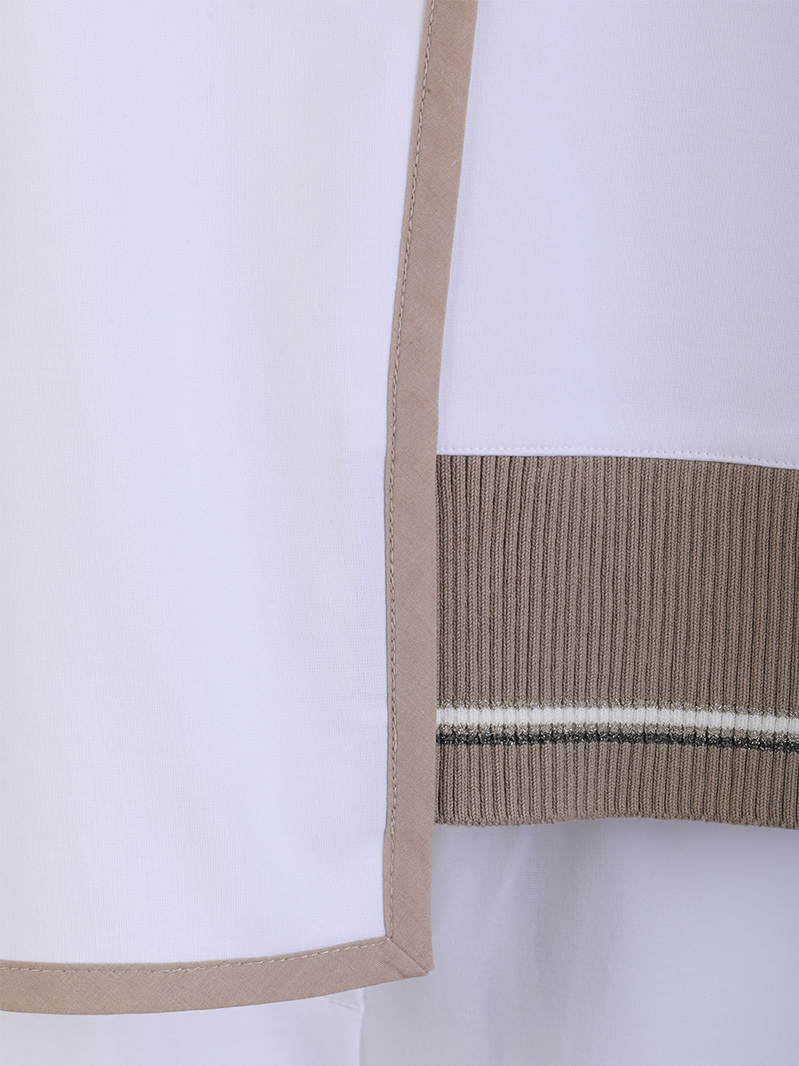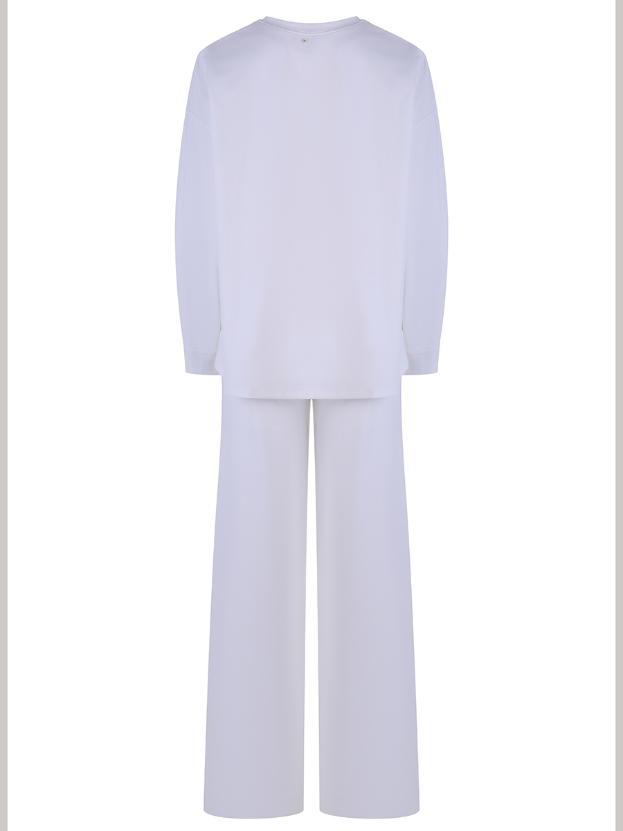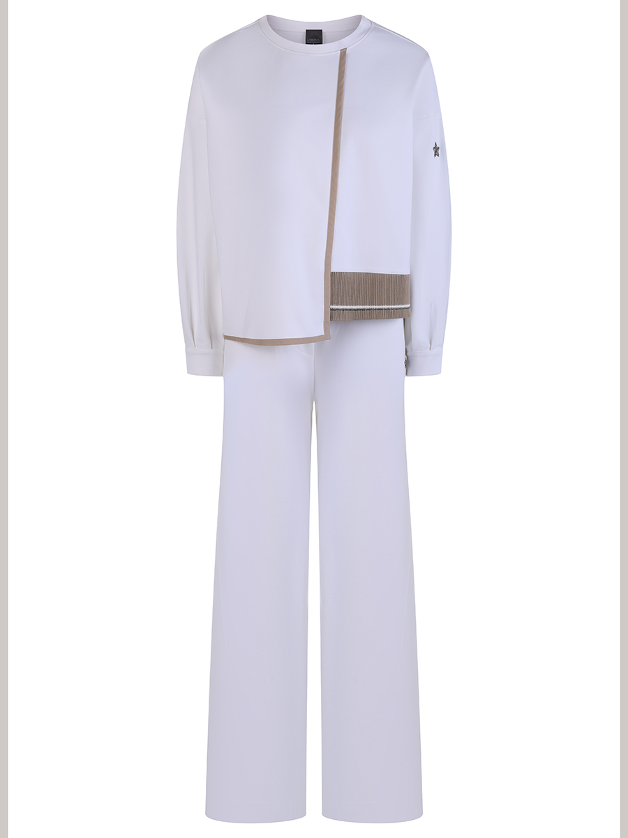 Белый костюм из смесового хлопка от LORENA ANTONIAZZI. Толстовка асимметричного кроя с круглым вырезом горловины, длинными рукавами с эластичными манжетами, контрастной отделкой и брендовой звездочкой на рукаве. Брюки прямого кроя с эластичным поясом на кулиске для выбора комфортной высоты посадки, прорезными карманами и брендовой звездочкой на бедре.
