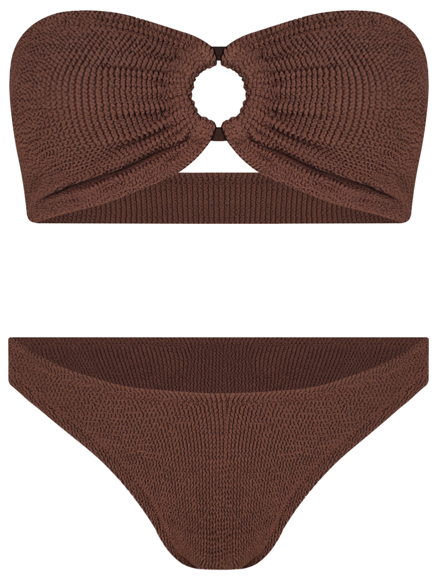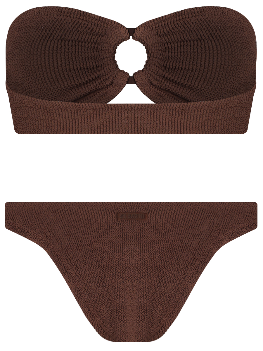 Купальный комплект Юлии Наоми от MC2 SAINT BARTH в насыщенном коричневом оттенке воплощает изысканный пляжный шик с эффектом креш, создающим стильную текстурированную поверхность. Топ-бандо с декоративным колечком на передней планке подчеркивает женственность силуэта, обеспечивая при этом надежную поддержку. Классические плавки с умеренной посадкой создают элегантный баланс между комфортом и соблазнительностью. Комплект выполнен из качественного быстросохнущего материала, сохраняющего форму даже после многократного контакта с водой. Идеальный выбор для отдыха на курорте, сочетающий в себе модный дизайн, практичность и непревзойденный комфорт.