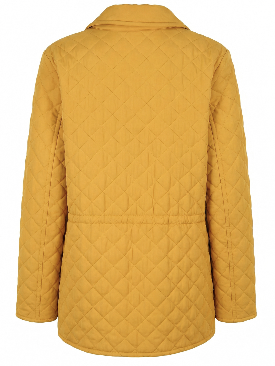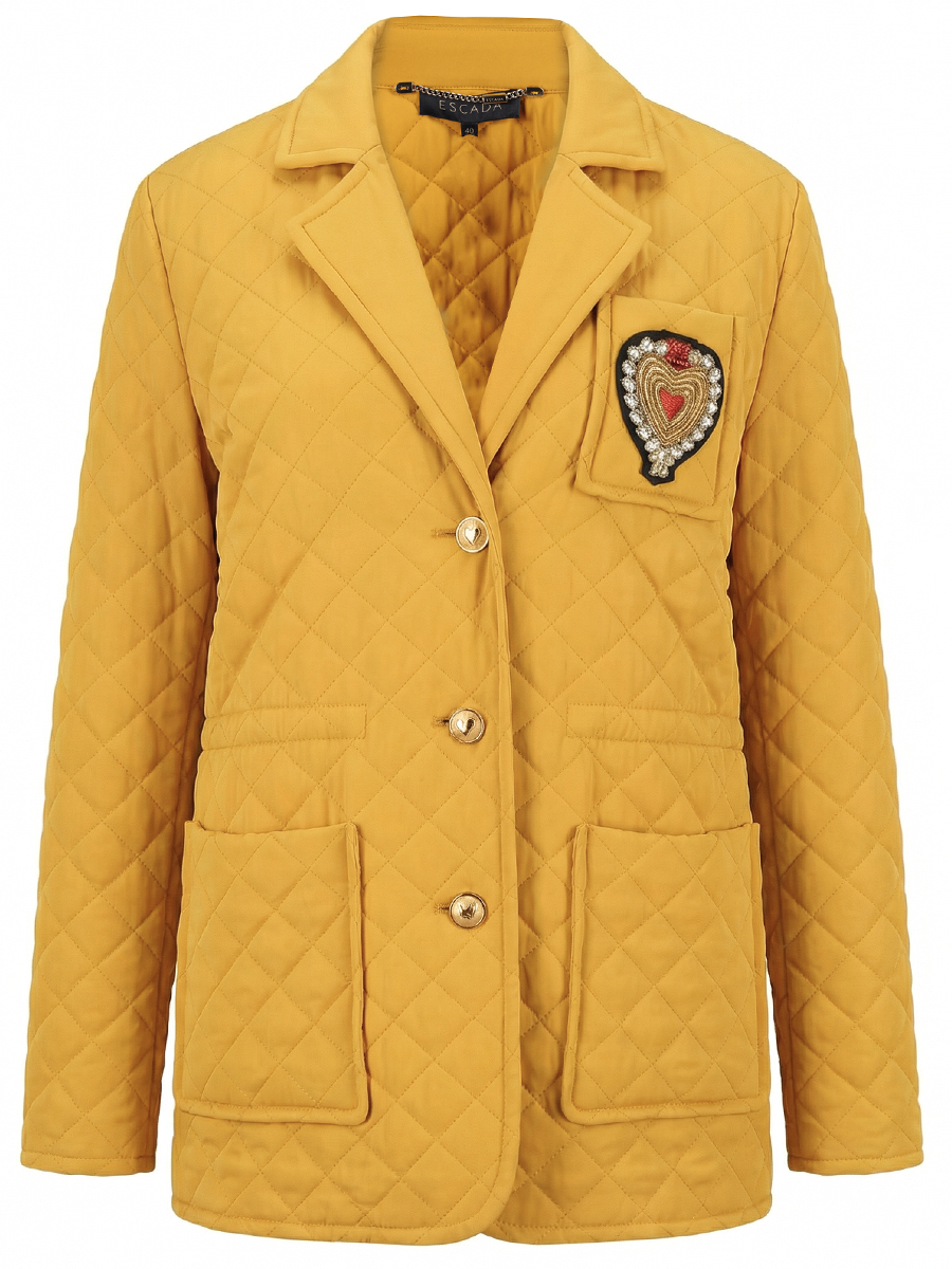 Мастера ESCADA включили в коллекцию прямую стёганую куртку, которая также может быть затянута скрытой резинкой. Для создания модели жёлтого цвета с горчичним оттенком использовали легкий шелковистый текстиль, устойчивый к капризам погоды. Утепленное изделие дополнили двумя объемными накладными карманами без клапанов и еще одним карманом на груди с нашивкой в виде фирменного сердца.