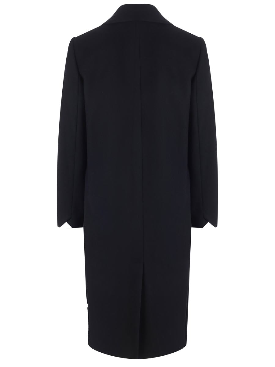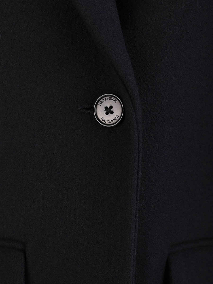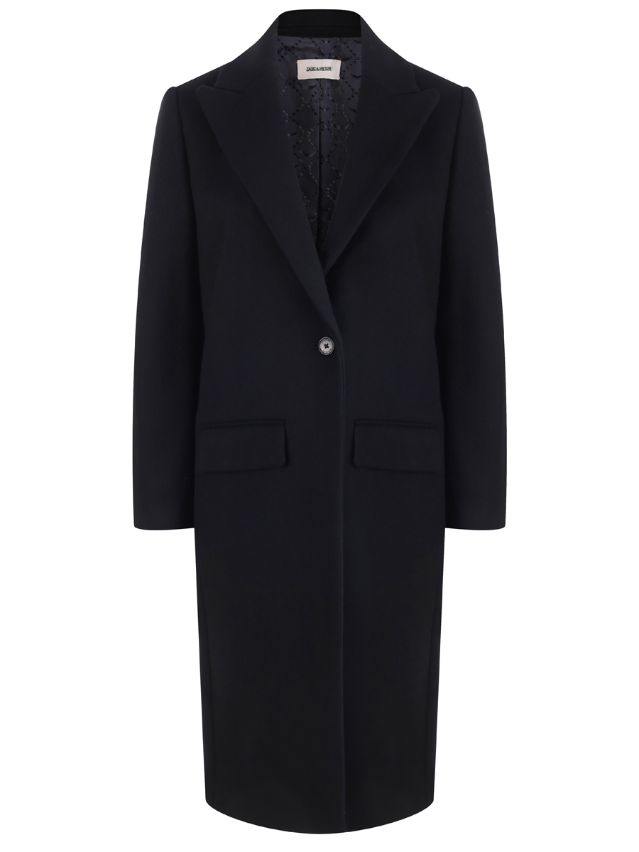 Черное однобортное пальто из смесовой шерсти от ZADIG VOLTAIRE. Модель прямого кроя с длинными рукавами, отложным воротником с лацканами, прорезными карманами с клапанами и застежкой на пуговицу. Высокая шлица сзади позволяет комфортно передвигаться и сидеть.