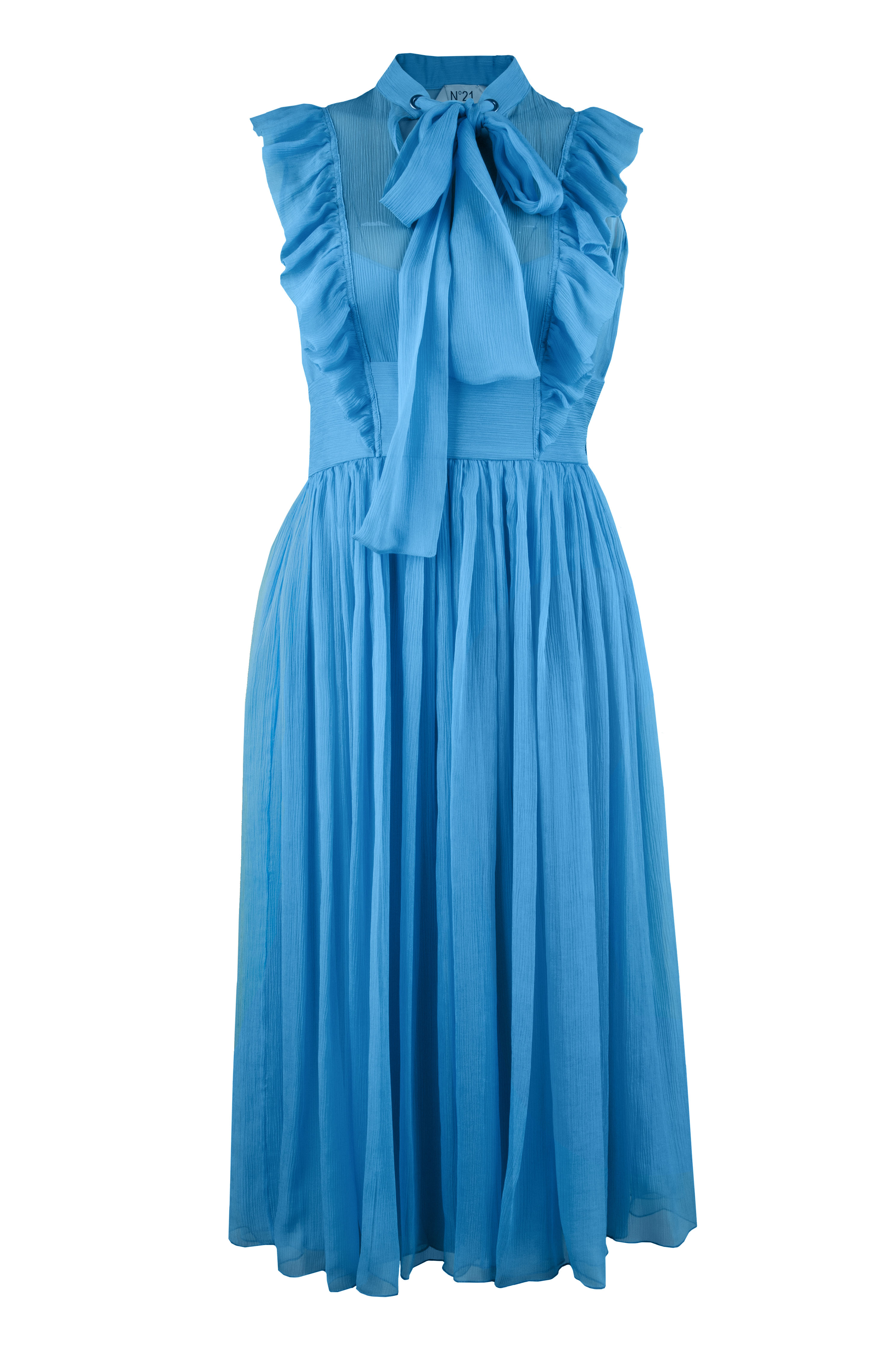 Шелковое полупрозрачное платье-миди с оборками и бантом. В комплекте имеется внутреннее платье-комбинация.