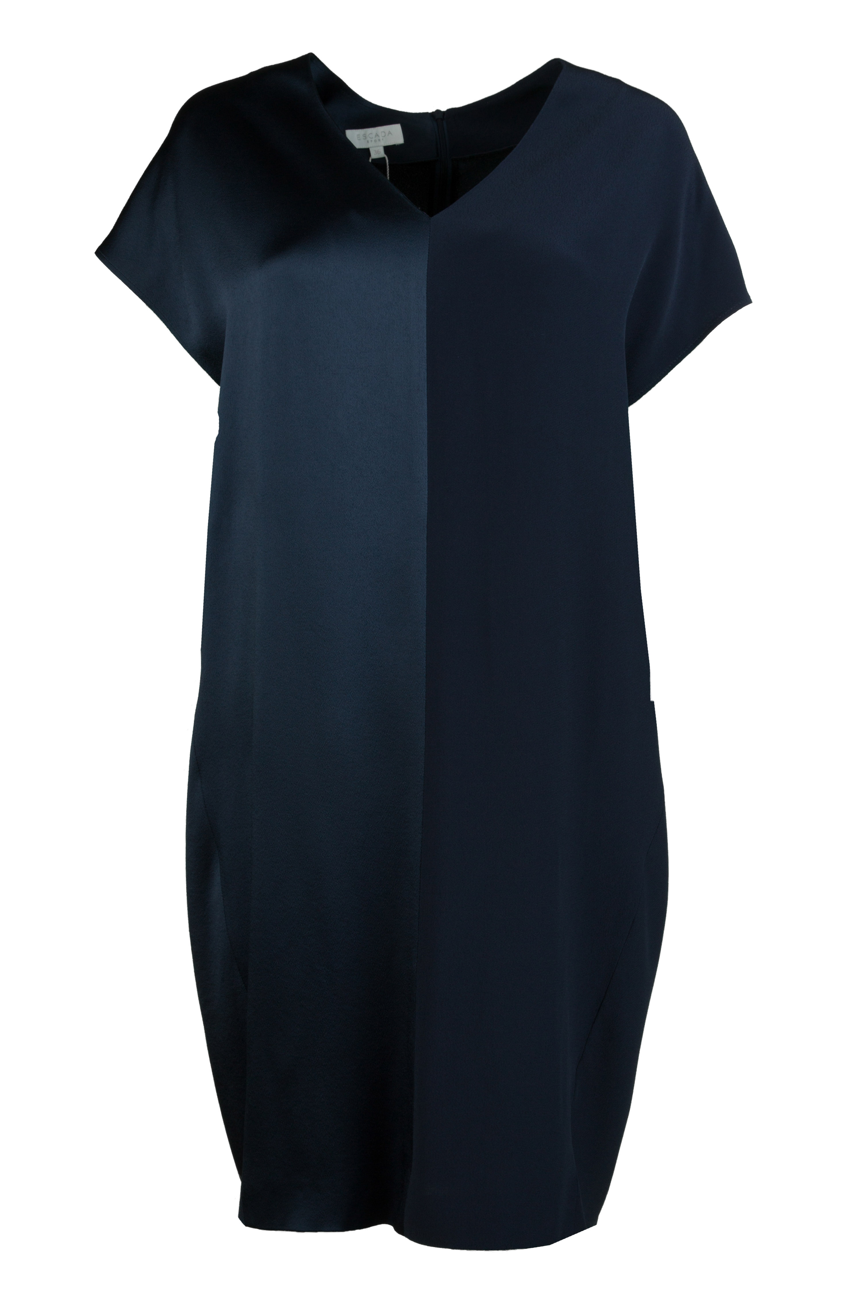Платье с молнией на спине, V-образным вырезом и короткими рукавами.