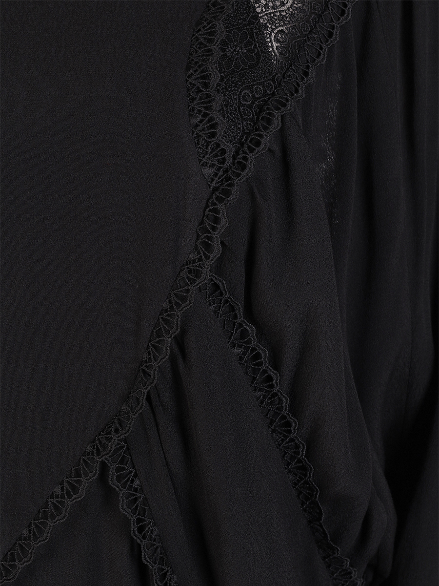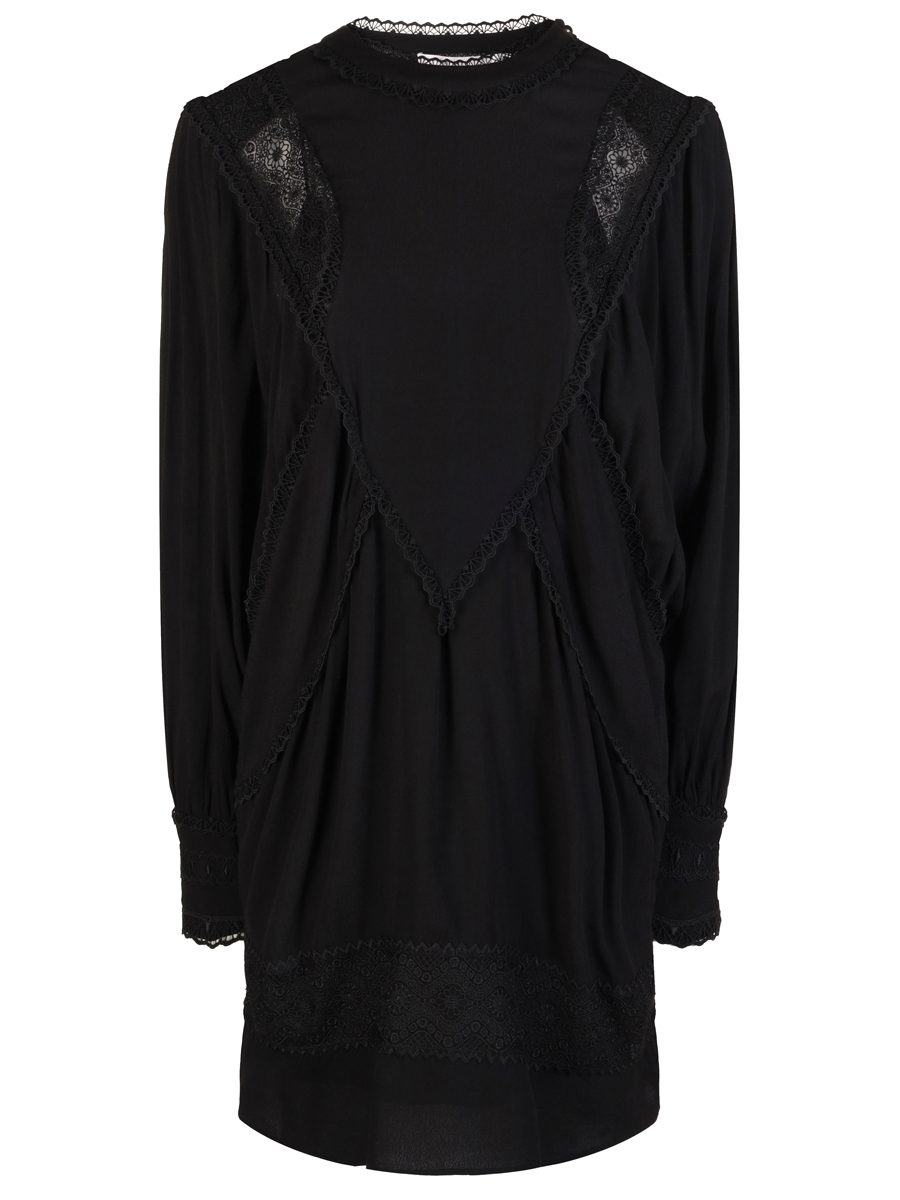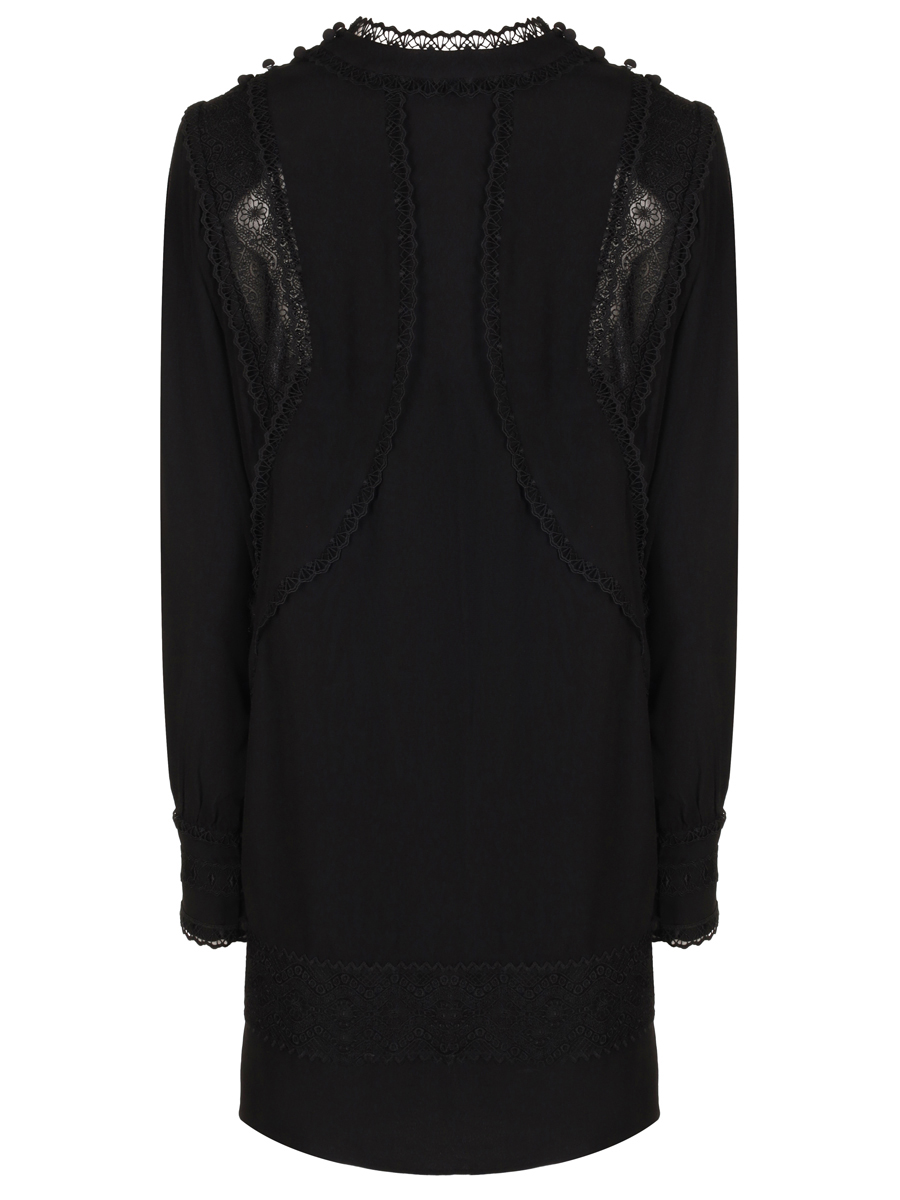 Черное платье из легкой вискозы от IRO. Модель свободного кроя с длинными рукавами, невысоким воротником-стойкой и отделкой кружевом в тон. Платье дополнено нижней базой в бельевом стиле на узких бретелях с глубоким V-образным вырезом на груди.