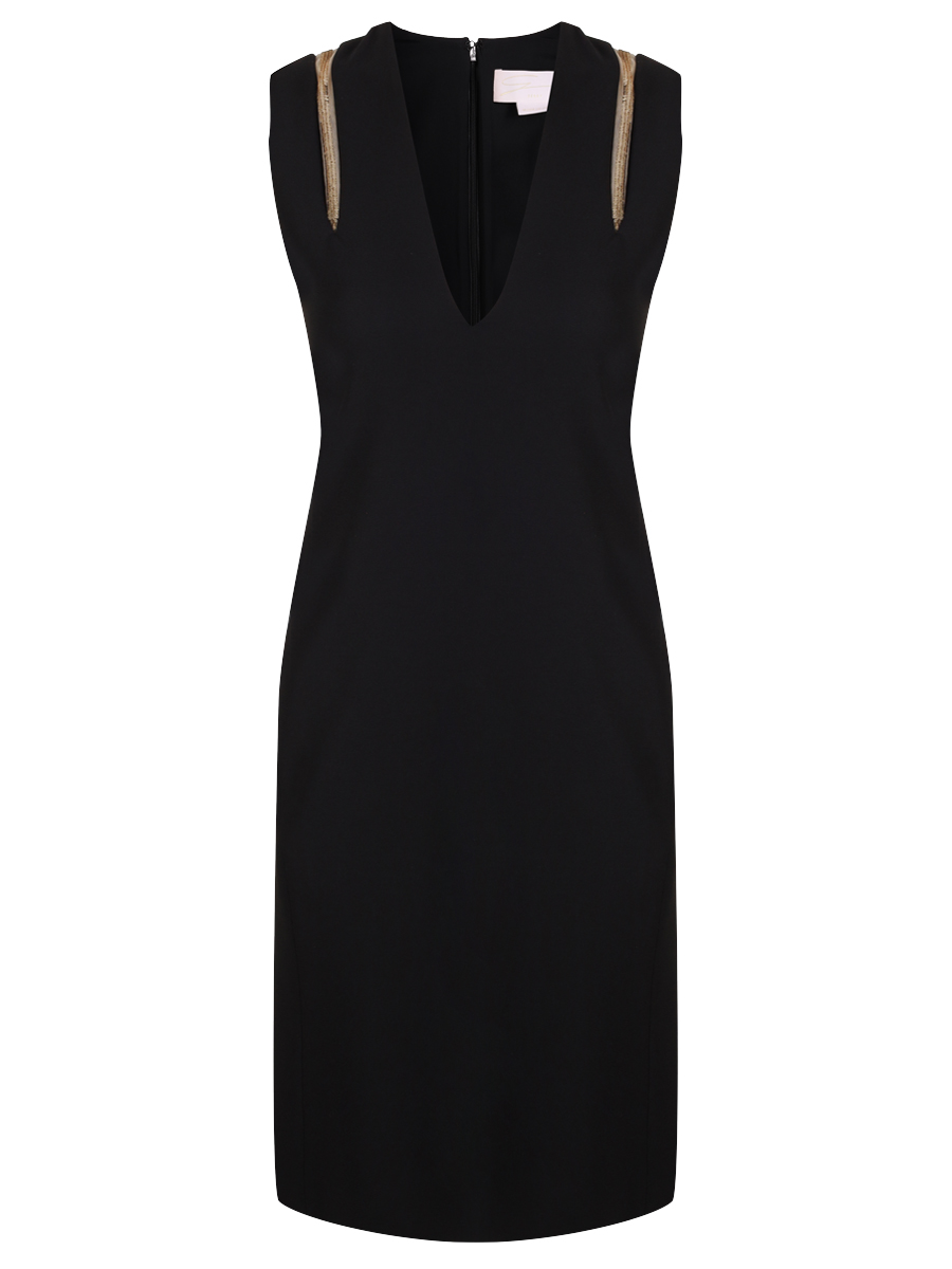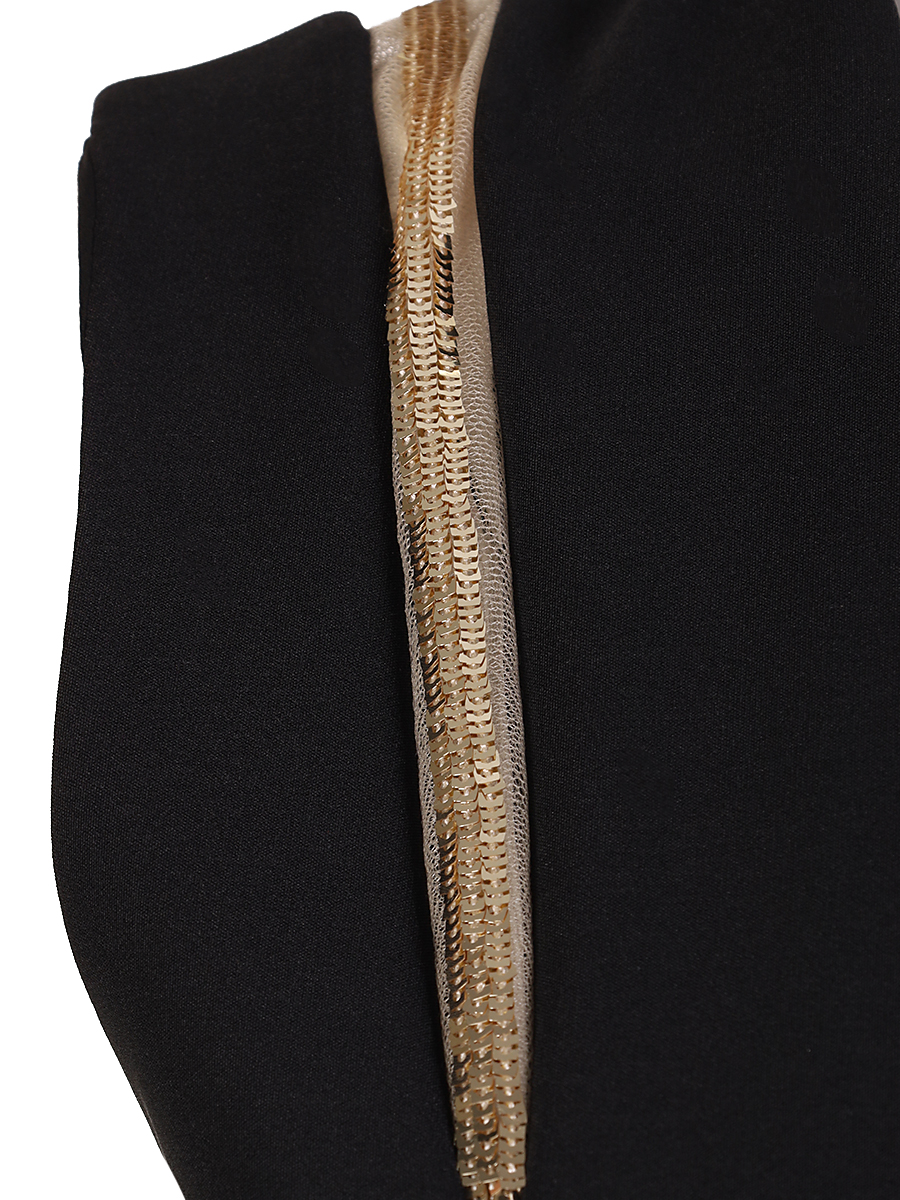 Черное платье от GENNY. Модель приталенного кроя без рукавов, рукавов с глубоким V-образным вырезом, контрастными вставками с пайетками на плечах и застежкой на потайную молнию. Классические линии кроя платья идеально обрисовывают женственный силуэт.