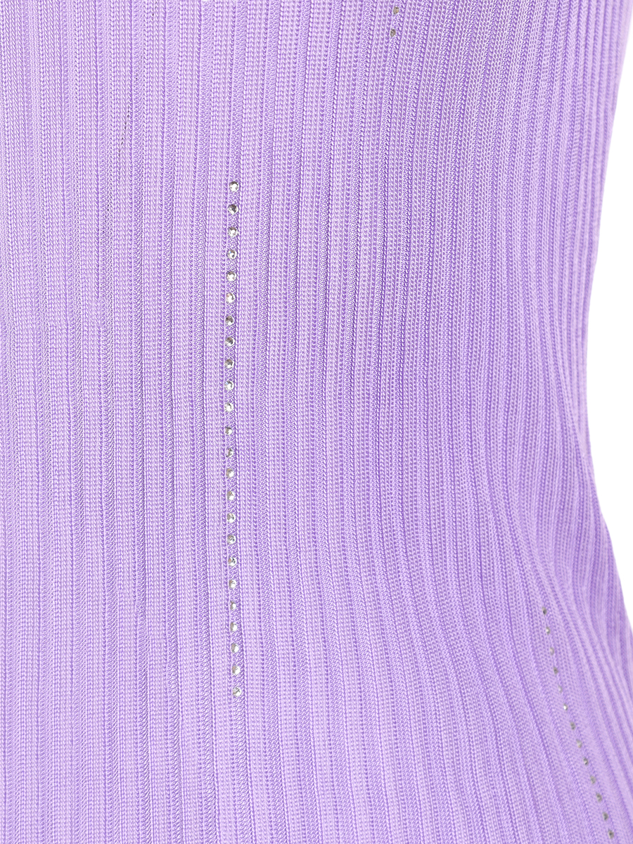 Сиреневый топ из вискозы от GENNY. Модель полуприлегающего кроя с широкими бретелями, круглым вырезом горловины и отделкой серебристыми стразами. Нежный трикотаж из вискозы хорошо пропускает воздух, не раздражает кожу и придает изделию приятный шелковистый эффект.