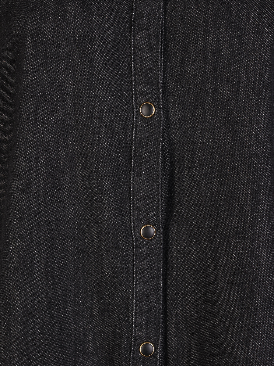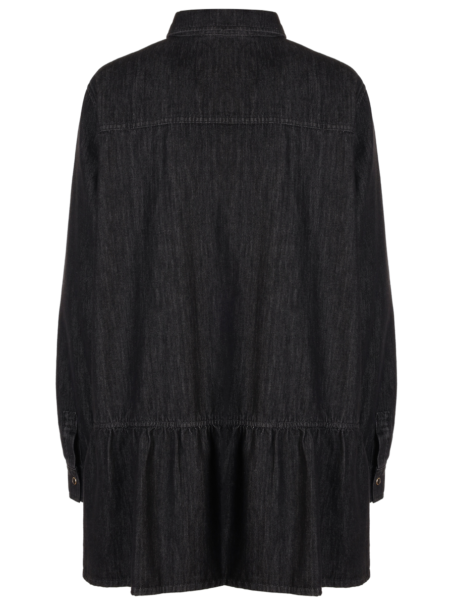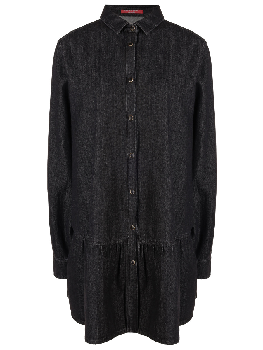 Черная туника из хлопкового денима от MARINA RINALDI. Модель свободного кроя с длинными рукавами, манжетами, отложным воротником, застежкой на кнопки и удлиненной оборкой по низу изделия.