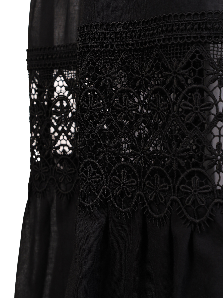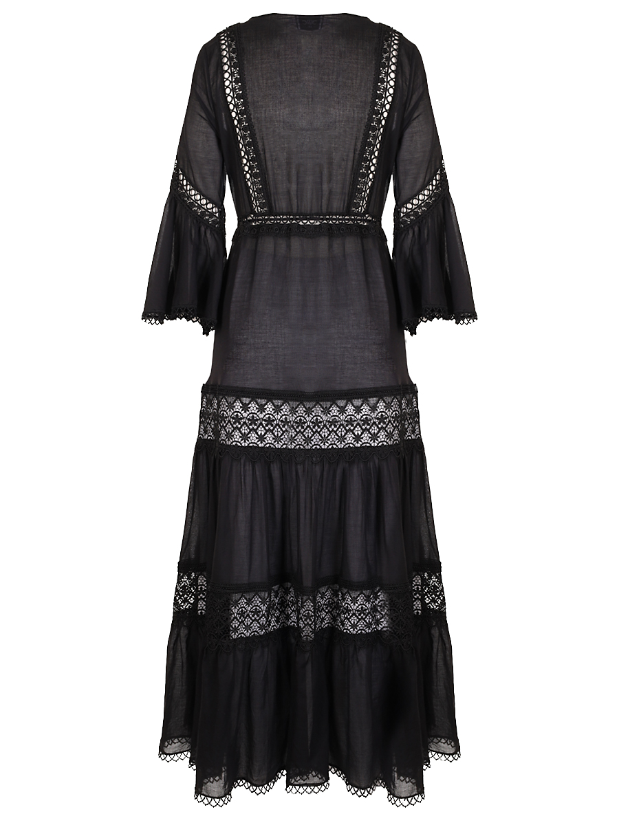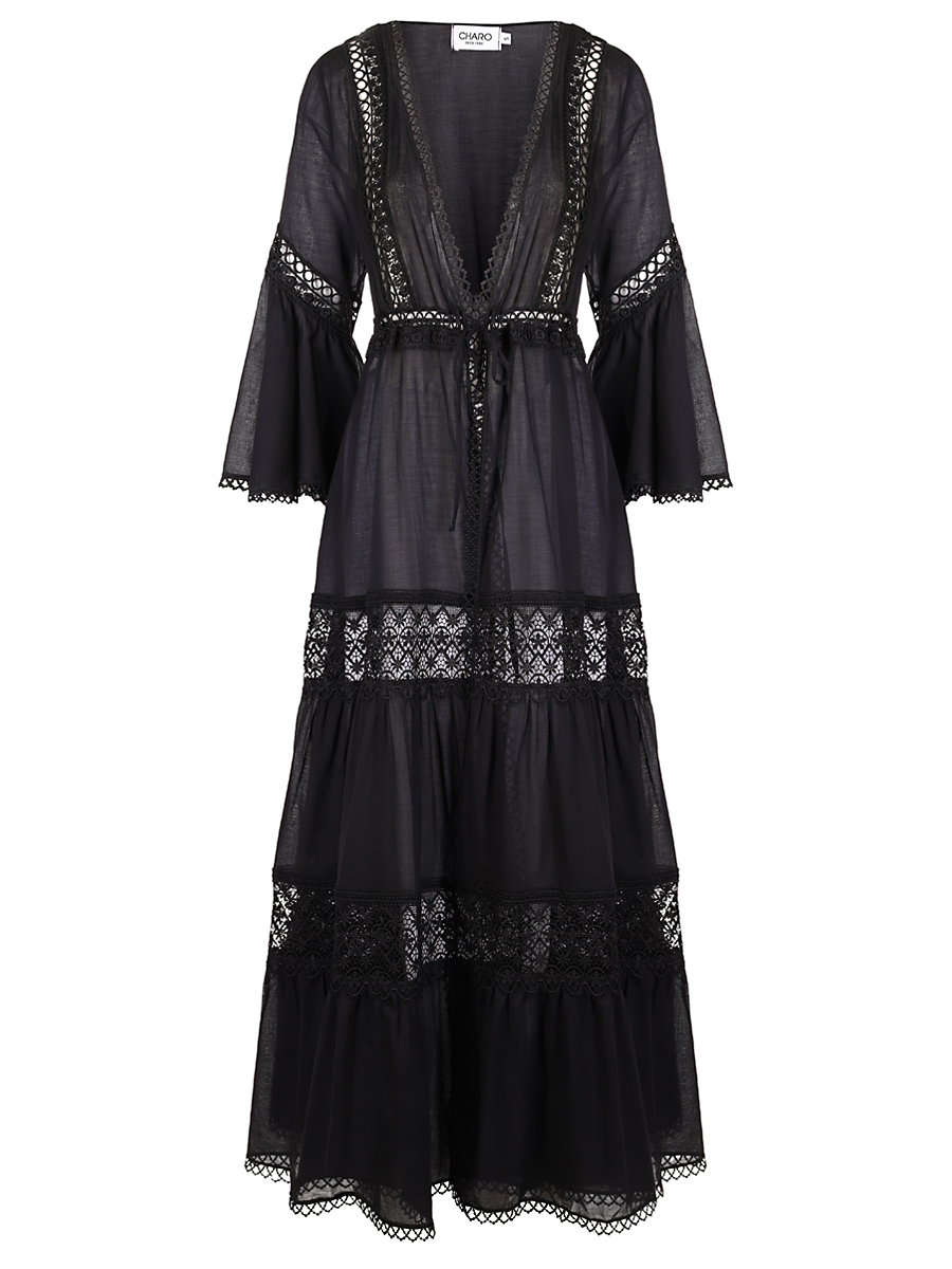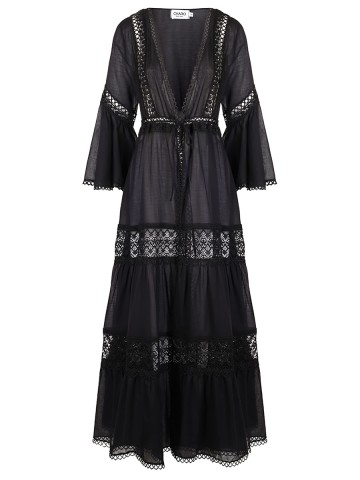 Туника CHARO RUIZ IBIZA – изысканное воплощение женственности и легкости. Модель приталенного силуэта с расклешенными рукавами сшита из невесомой шелковистой хлопковой вуали, которая создает эффект воздушного потока и нежно скользит по телу. Особую романтичность тунике придают полупрозрачные гипюровые вставки, искусно перекликающиеся с декоративной корсетной шнуровкой на груди. Длинный крой подчеркивает изящество фигуры, а расклешенные рукава добавляют образу динамики и легкости.