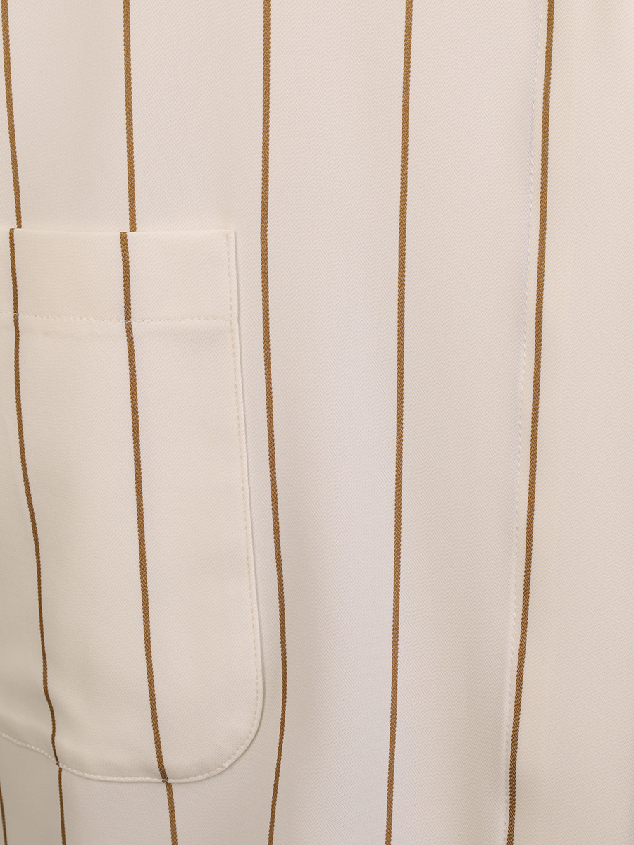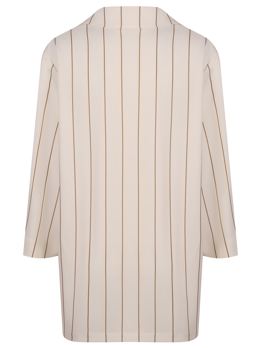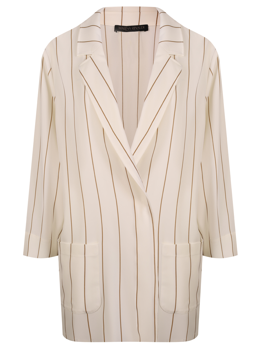 Кремовый жакет MARINA RINALDI в тонкую полоску — воплощение летней элегантности с итальянским характером. Прямой крой с укороченными рукавами создает свежий силуэт, а отложной воротник с лацканами и накладные карманы добавляют классическую строгость. Воздушная полоска визуально вытягивает фигуру, делая образ утонченным.