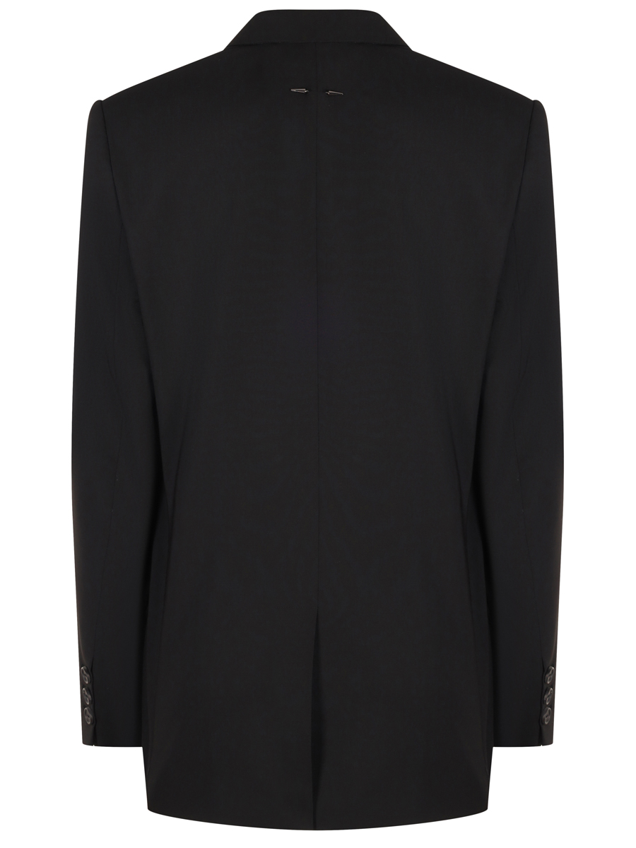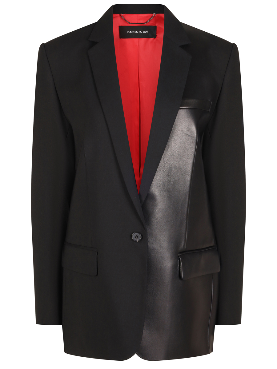 Черный комбинированный пиджак из костюмной шерсти и гладкой кожи от BARBARA BUI. Однобортная модель прямого кроя с длинными рукавами, отложным воротником с лацканами, листочкой, прорезными карманами с клапанами, застежкой на пуговицу, шлицей и фирменным съемным пирсингом на спине. Пиджак станет ярким дополнением повседневных образов и поможет выделиться из толпы.