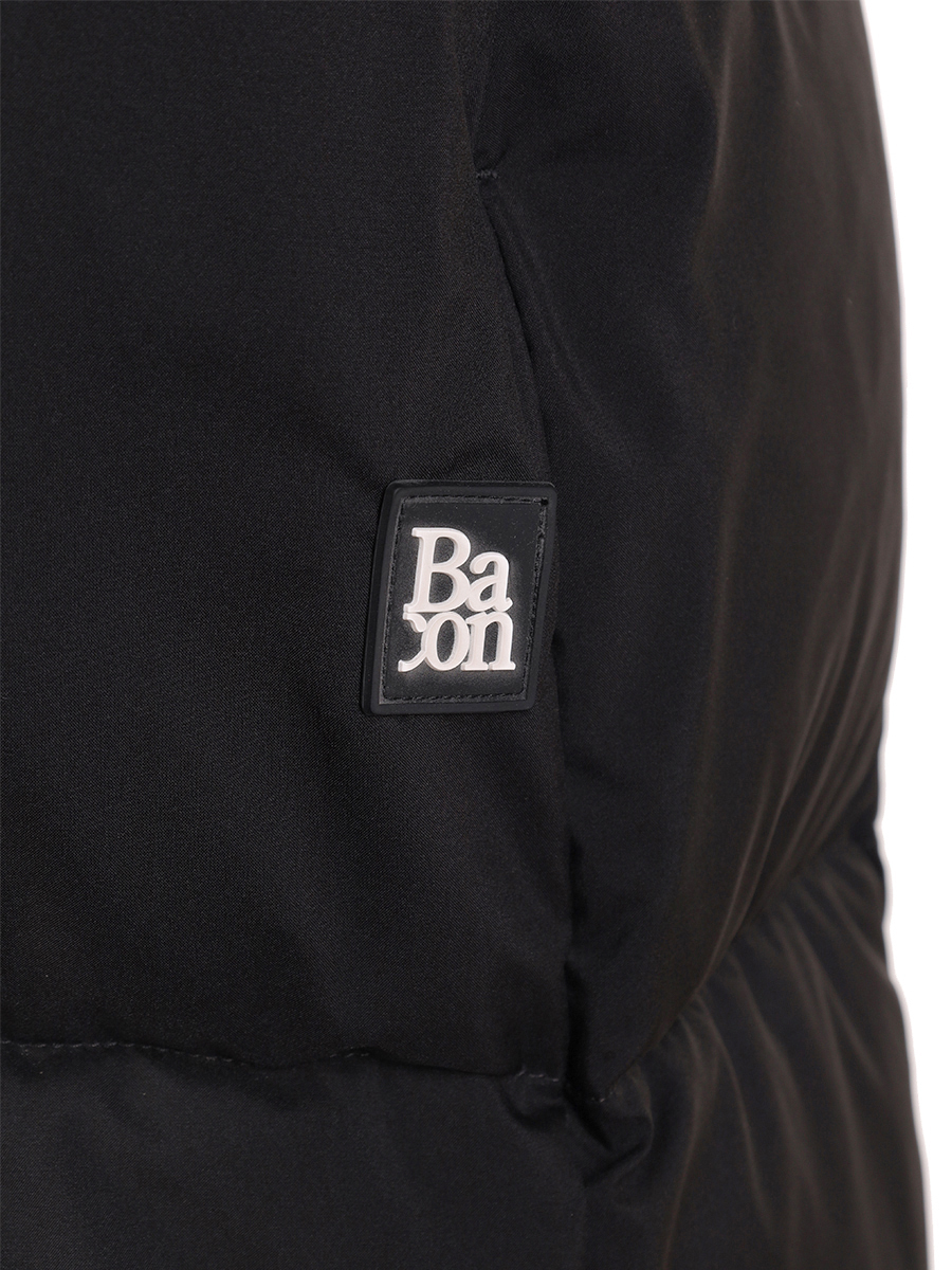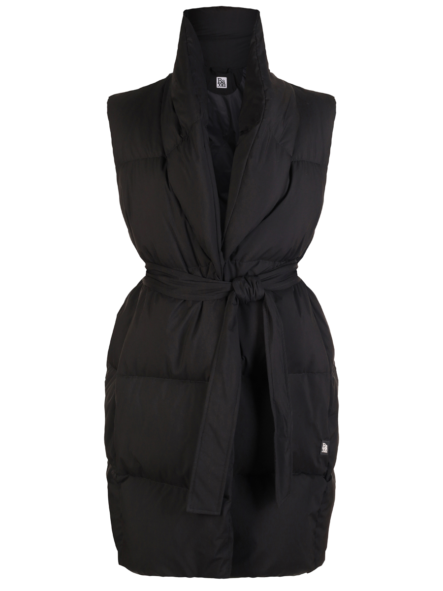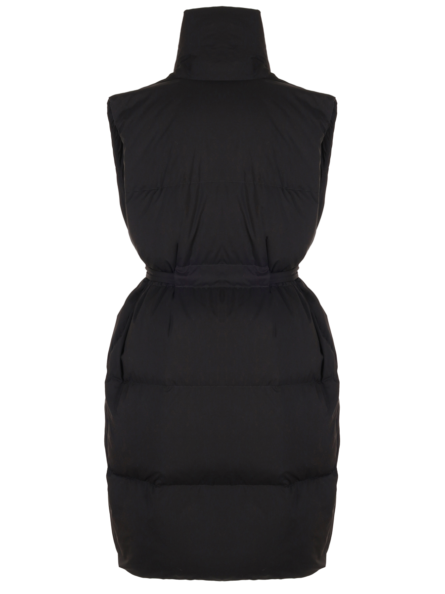 Черный удлиненный стеганый жилет с натуральным пуховым наполнителем от BACON. Модель с высоким воротником, прорезными карманами и поясом в тон, который регулирует глубину запаха и структурирует силуэт, подчеркивая талию. Благодаря стежке наполнитель равномерно распределен внутри изделия и лучше сохраняет тепло.