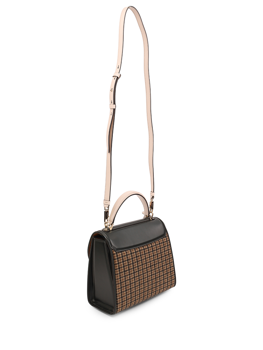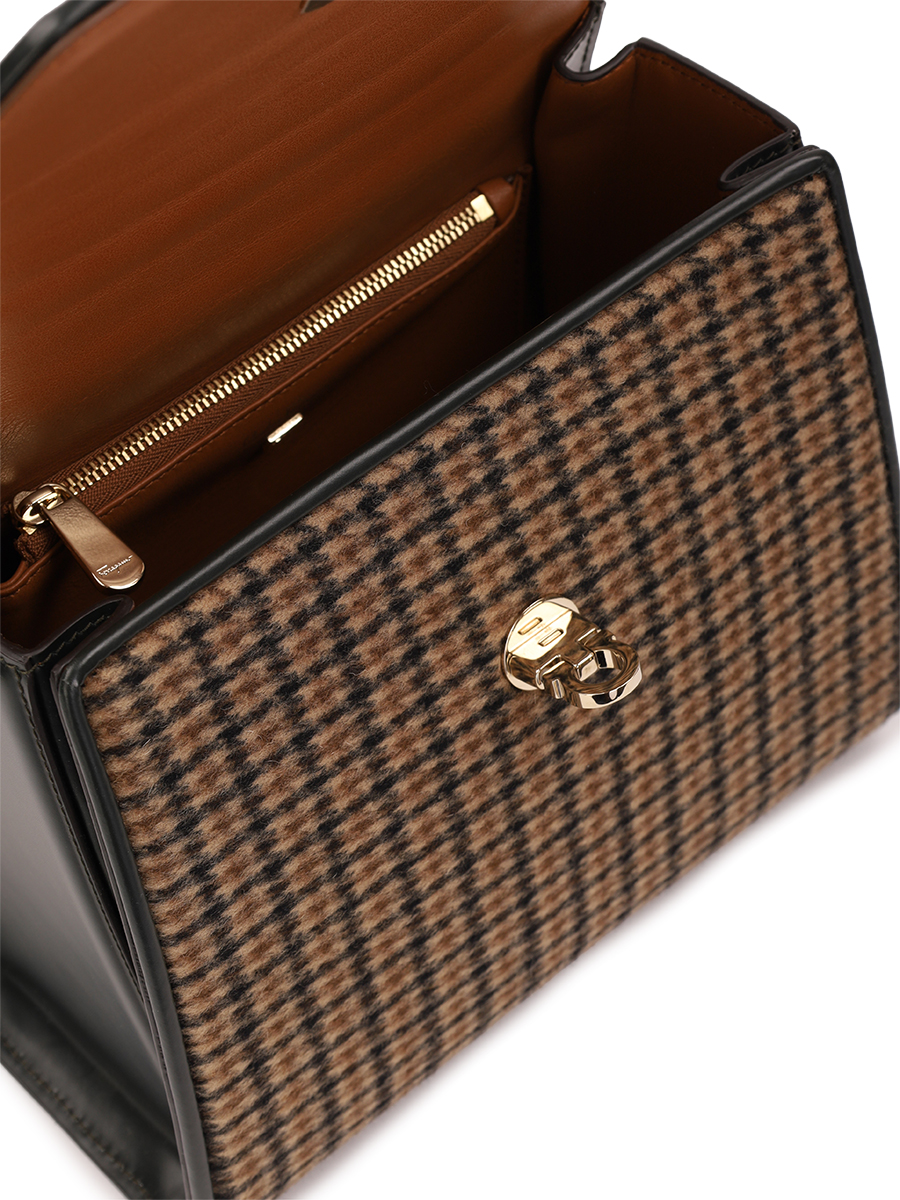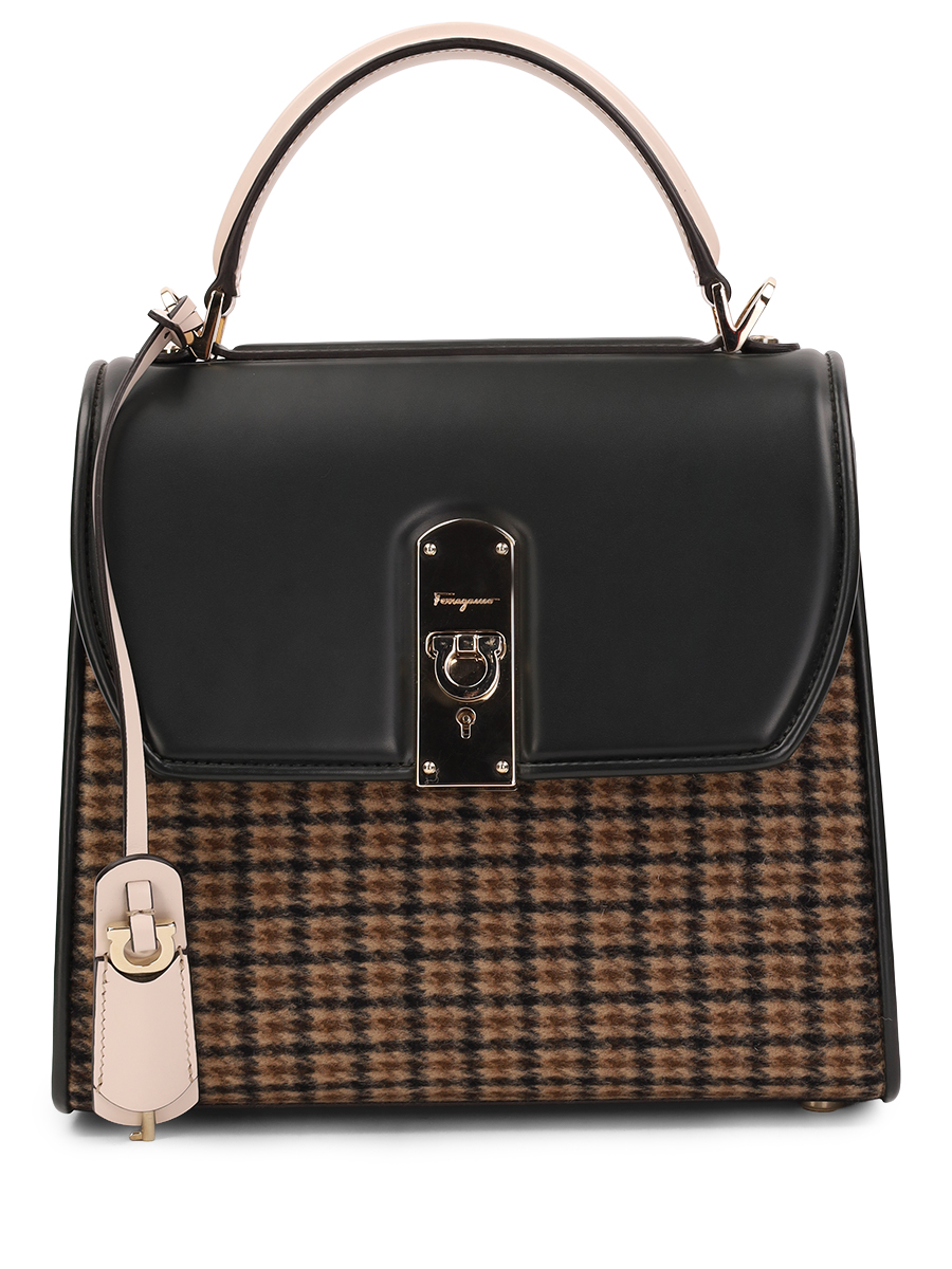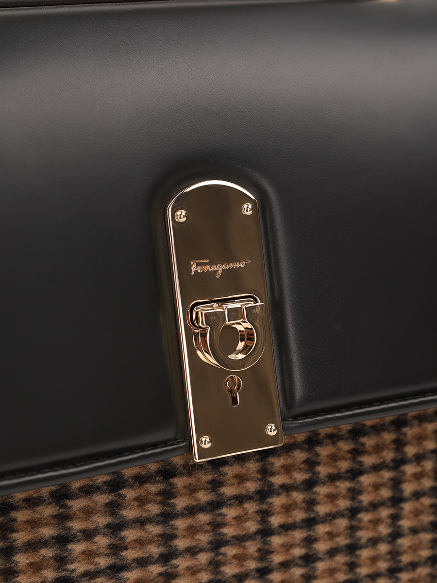 Сумка мини на плечо Boxys от Salvatore Ferragamo. Съемный ремень на плечо, закругленная ручка, золотистая фурнитура, клапан с поворачивающейся застежкой, фирменная пряжка 'Gancio', внутренний карман на молнии, узор в клетку.