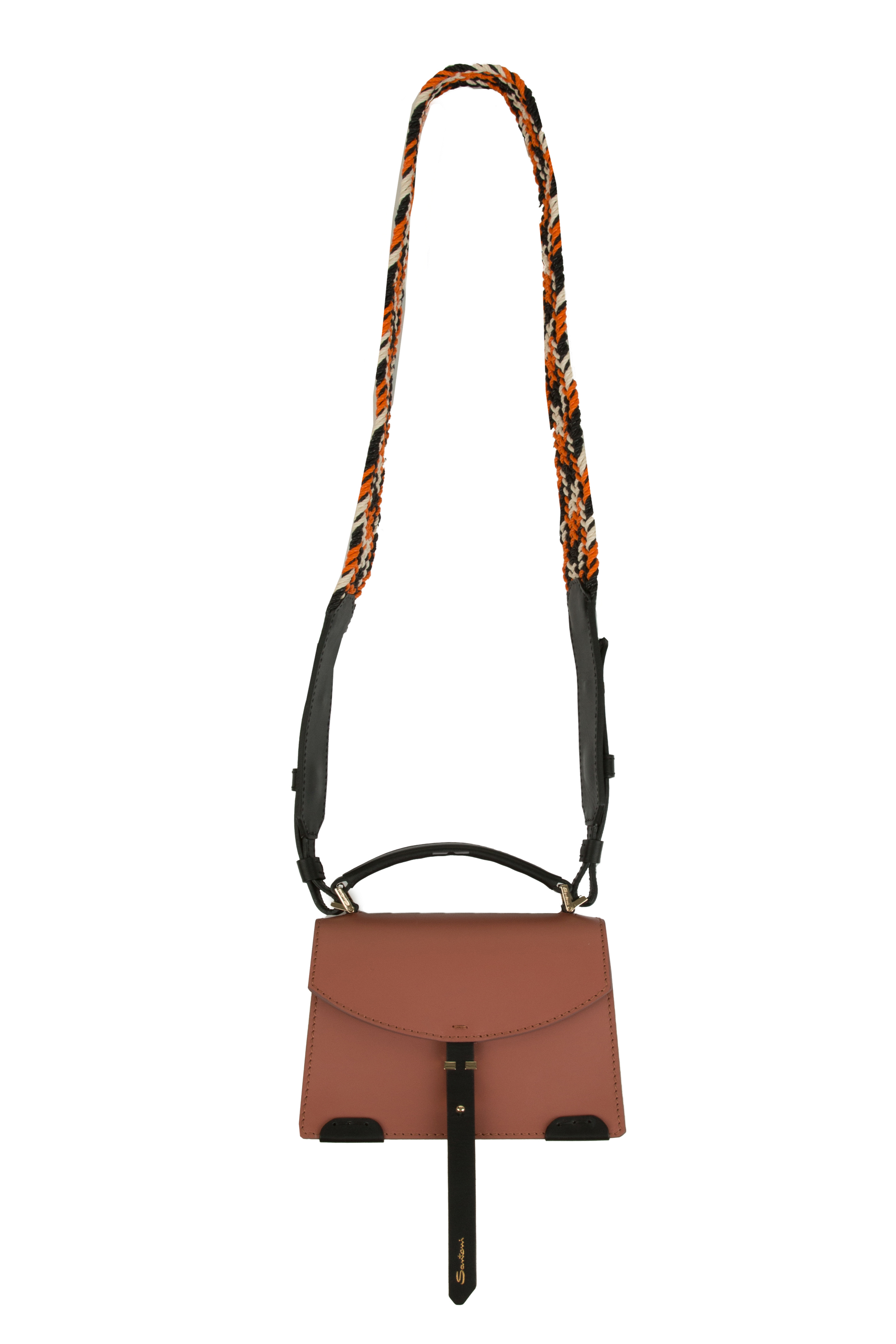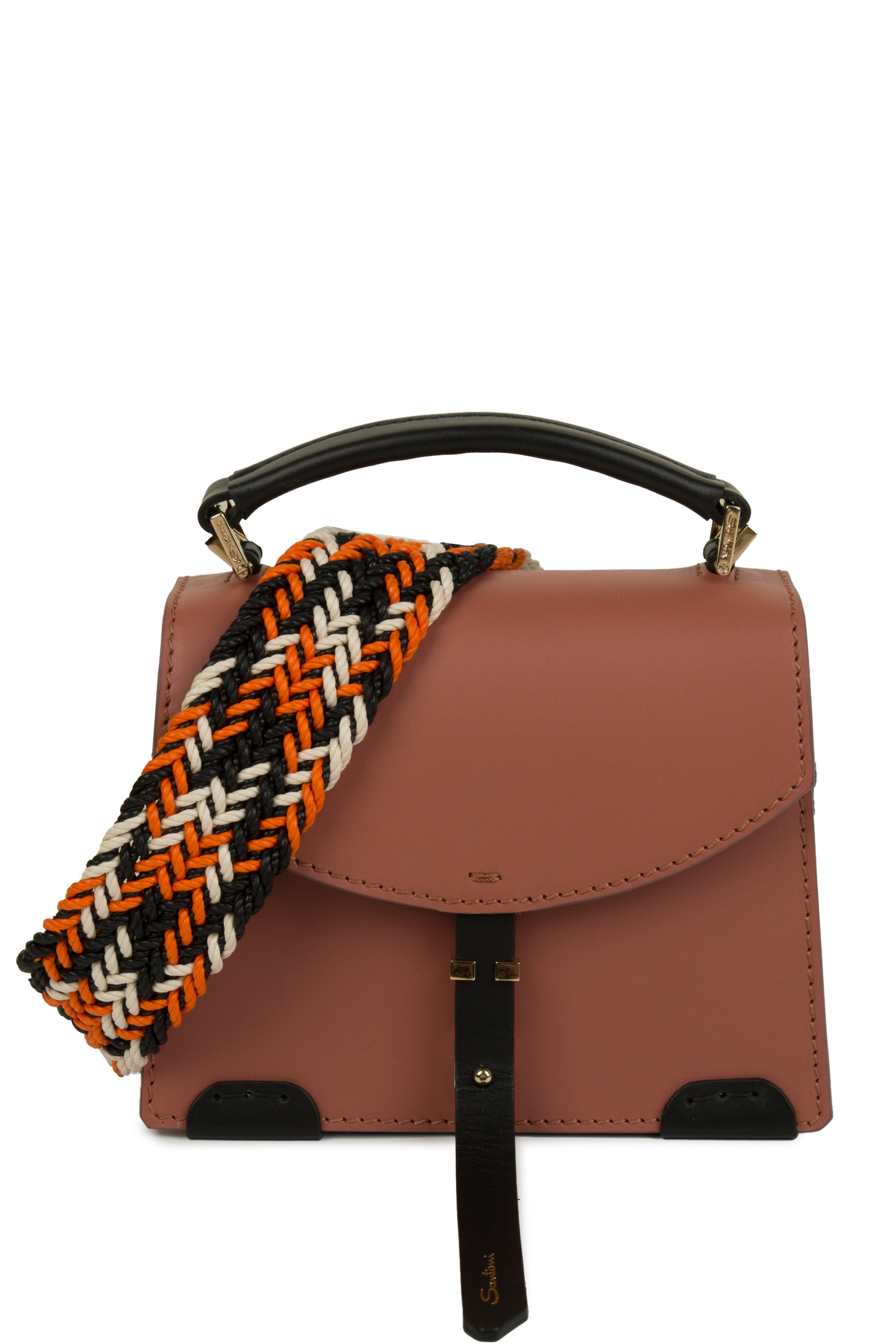 Кожаная сумка геометрической формы с контрастными деталями на плетенном ремешке.